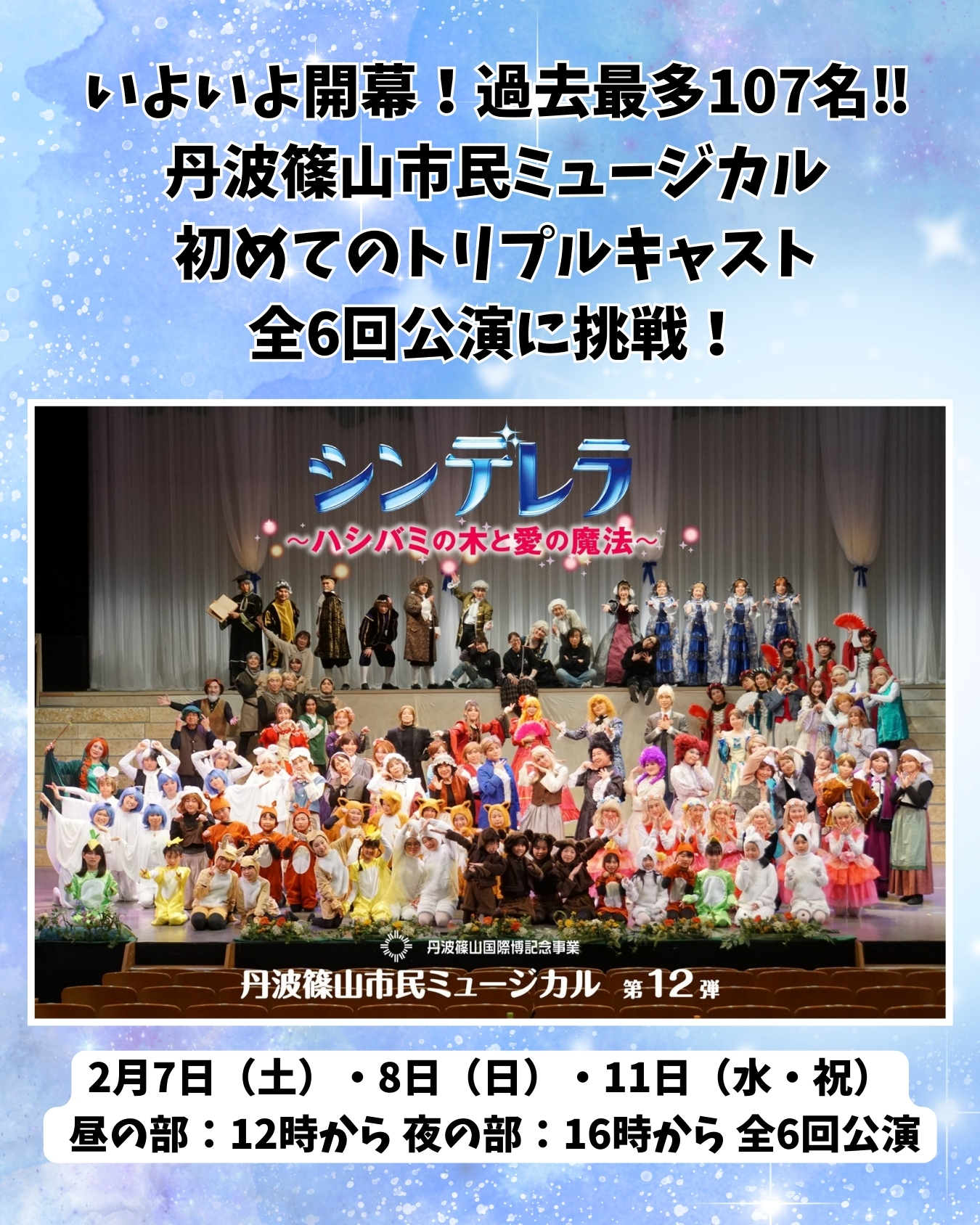 ミュージカル「シンデレラ」8日(日曜)開催します。 Tweet 更新日:2026年02月08日 丹波篠山市民ミュージカル 第12弾「シンデレラ」 大変な天候となりましたが、2月8日(日曜日)の公演は予定通り開催いたします。 107名の出演者も準備を整えてお待ちしています。 ご来場なされる方は、お気をつけてお越しください。 この記事に関するお問い合わせ先 田園交響ホール〒669-2332 兵庫県丹波篠山市北新町41電話番号:079-552-3600メールフォームによるお問い合わせ