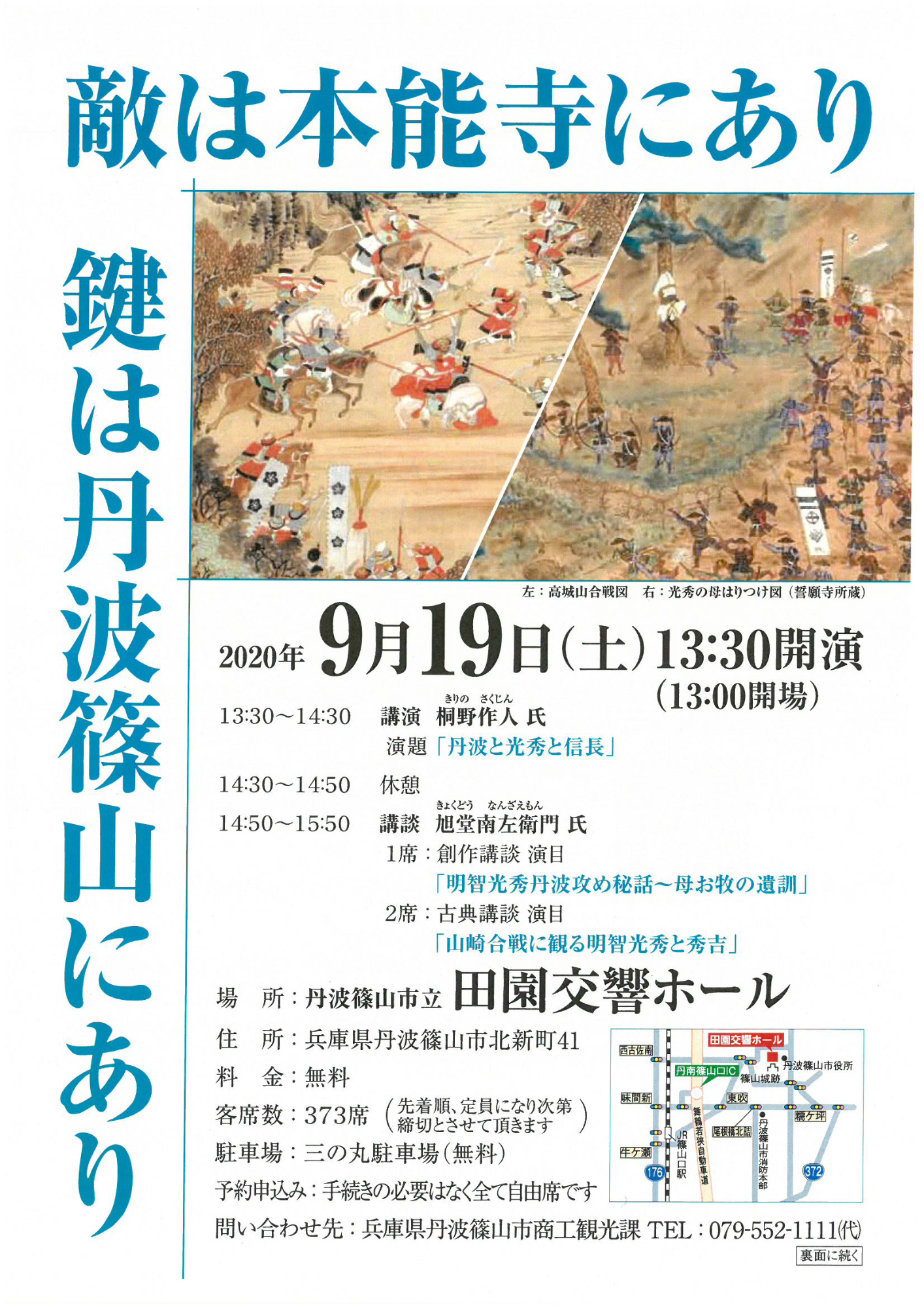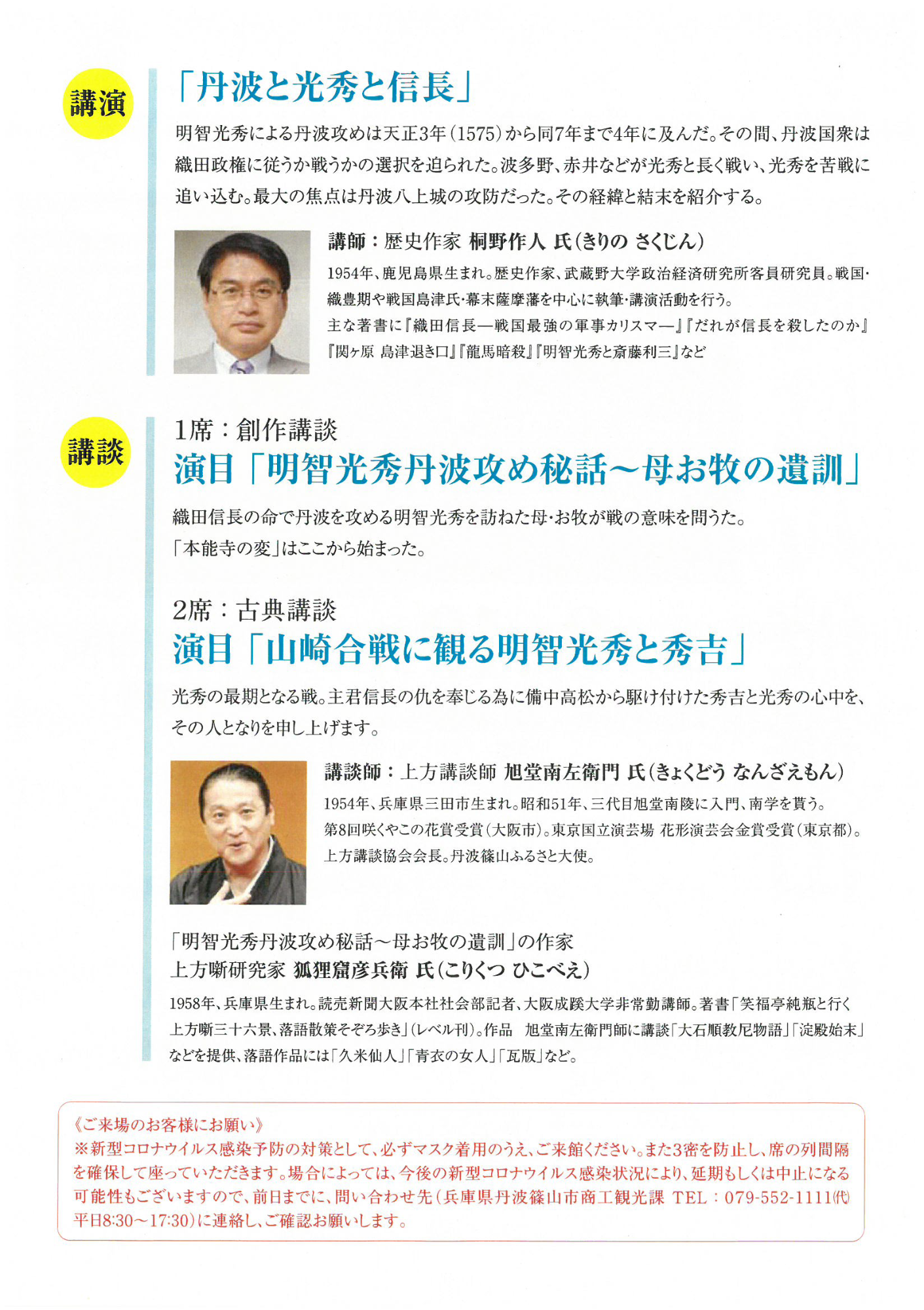 9月19日(土曜日)午後1時30分から田園交響ホールにて、光秀の丹波攻めを演題とした旭堂南左衛門さんの講談と桐野作人さんの講演があります。