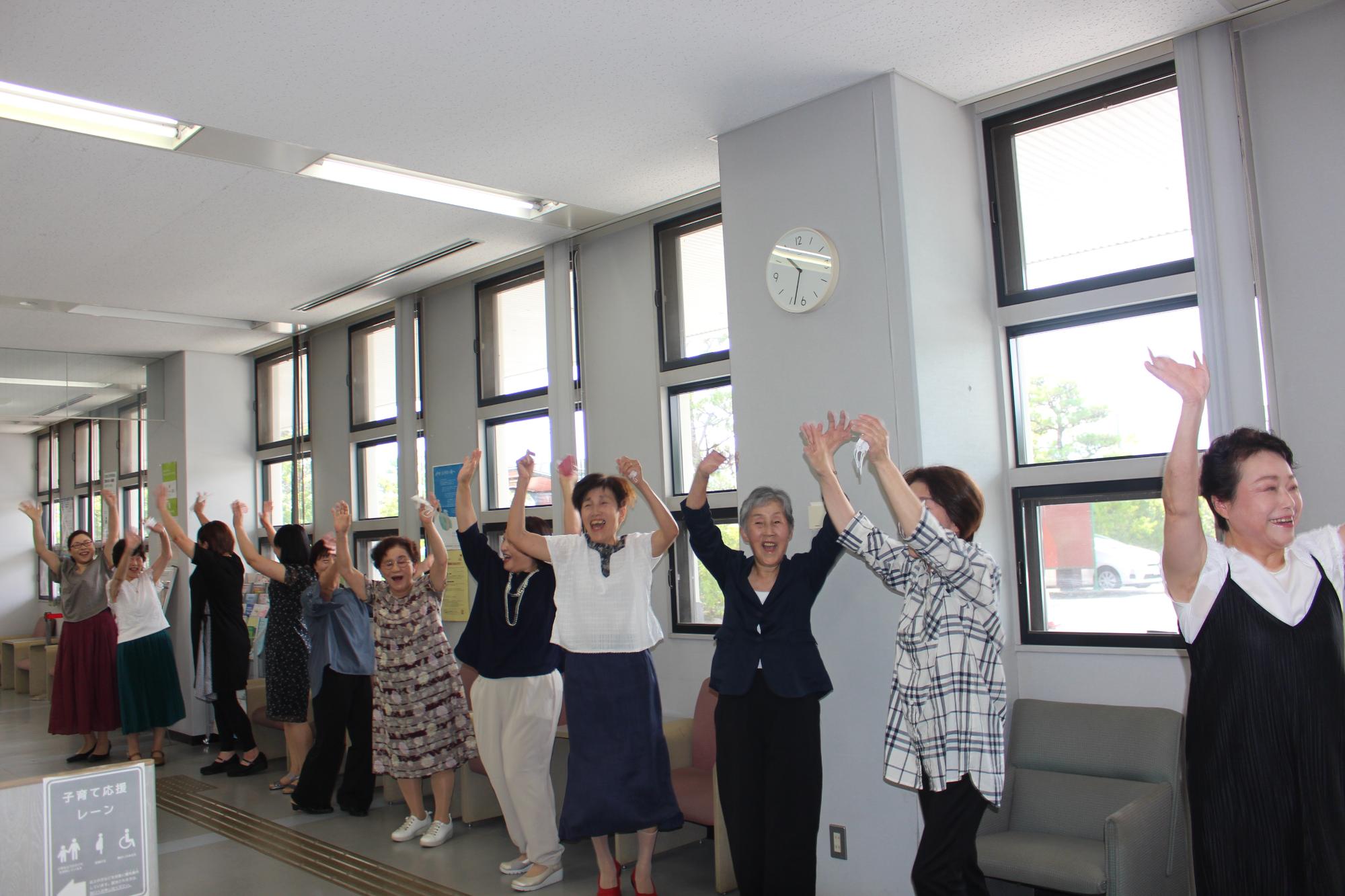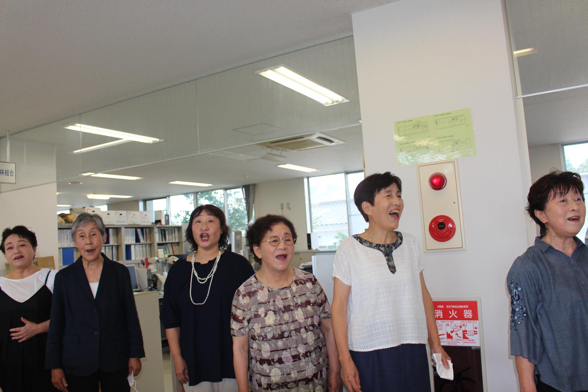 せっかくの機会ですので、夏の甲子園の大会歌「栄冠は君に輝く」を庁舎で披露していただきました。「何度でも歌えます」と言われるので、のべ5回市役所の各所で歌ってもらいました。レヴールの皆さんの歌声を聴いて、みんなを楽しく明るくする歌の力を改めて実感しました。