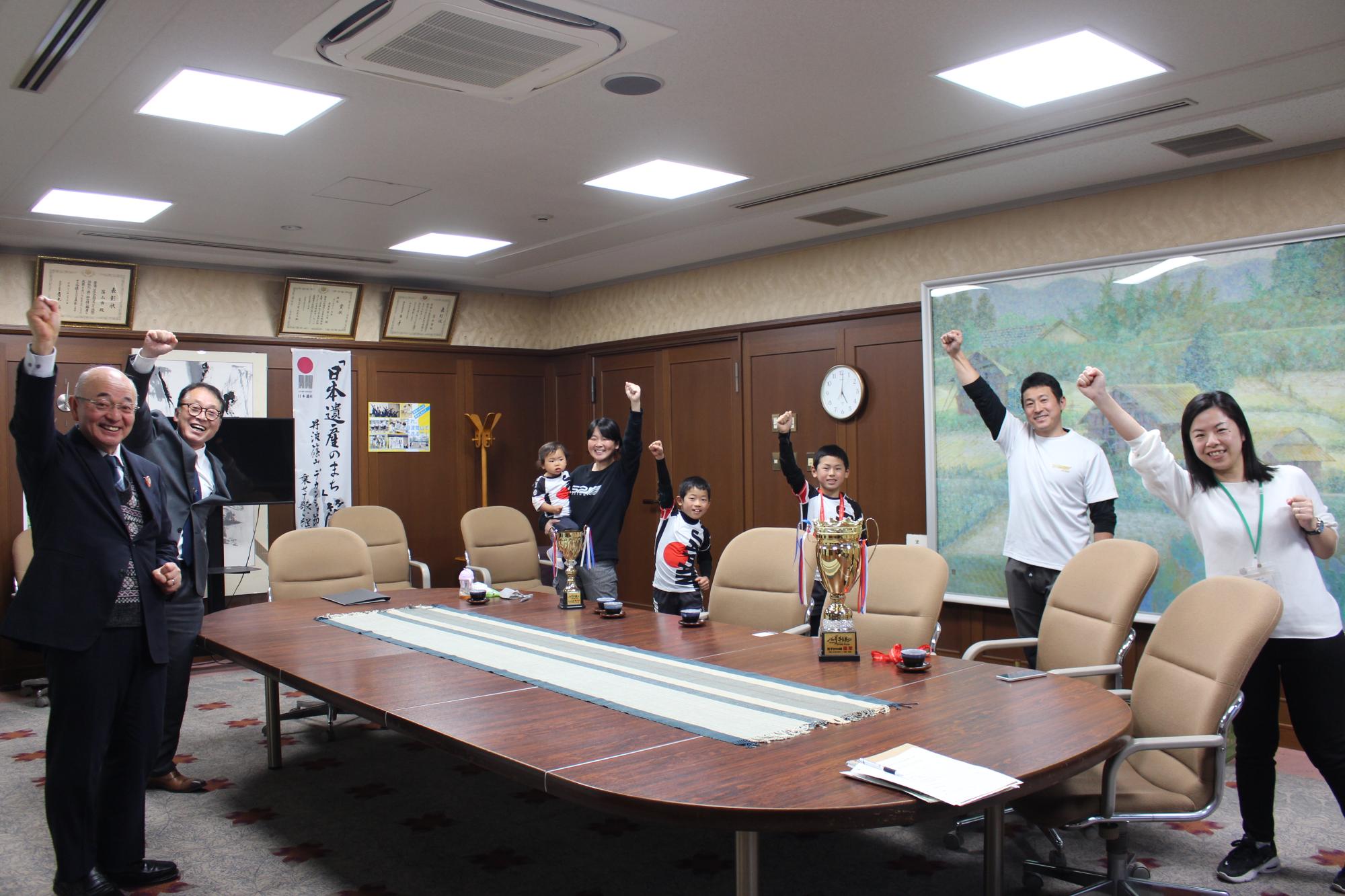 光輝くメダル、トロフィーと一緒に記念撮影をした時の笑顔、勇ましい顔がとても印象的で、最後に丹後教育長からいつもの激励エールを送りました。