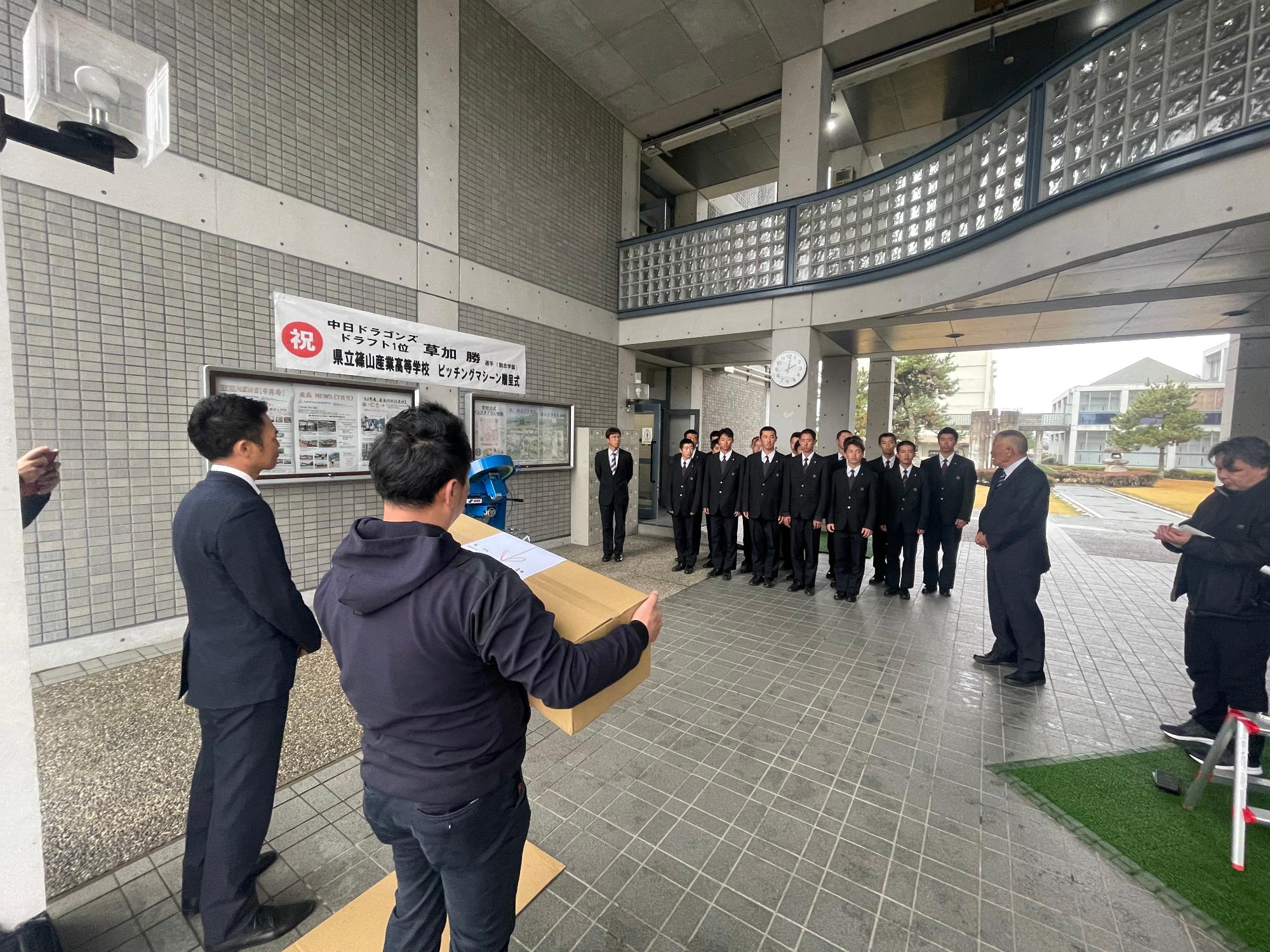 長澤スポーツ振興官の創志学園高の教え子で、亜細亜大学からドラフト1位で中日ドラゴンズに入団した草加 勝(くさか しょう)投手から、篠山産業高校野球部へピッチングマシン、バット10本、ノックバット3本の寄贈がありました。