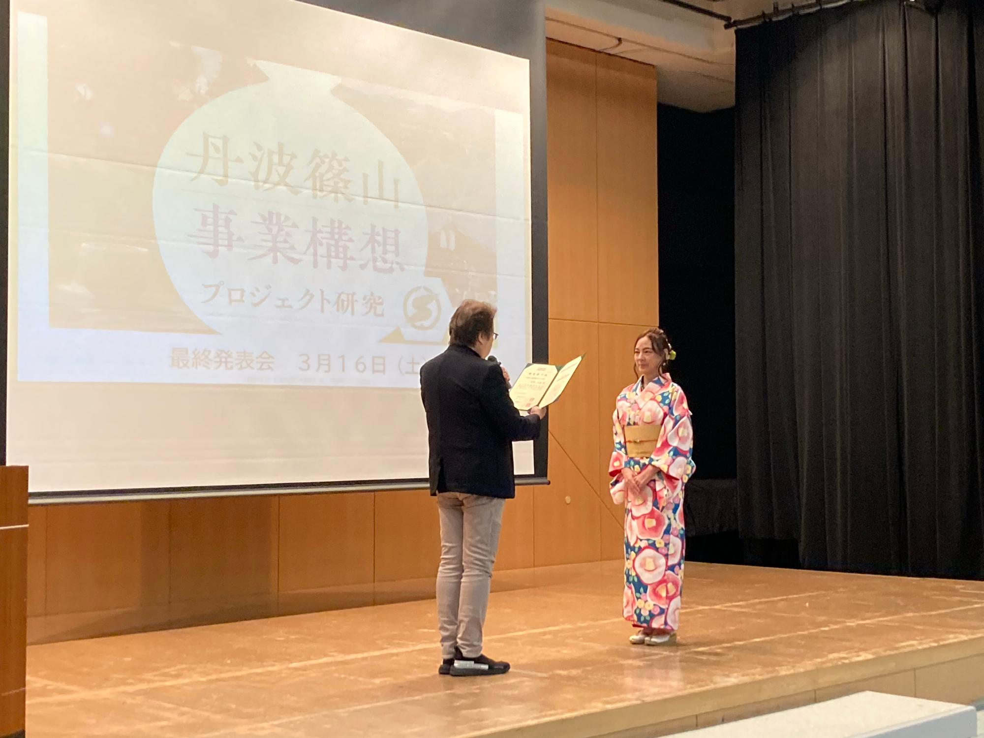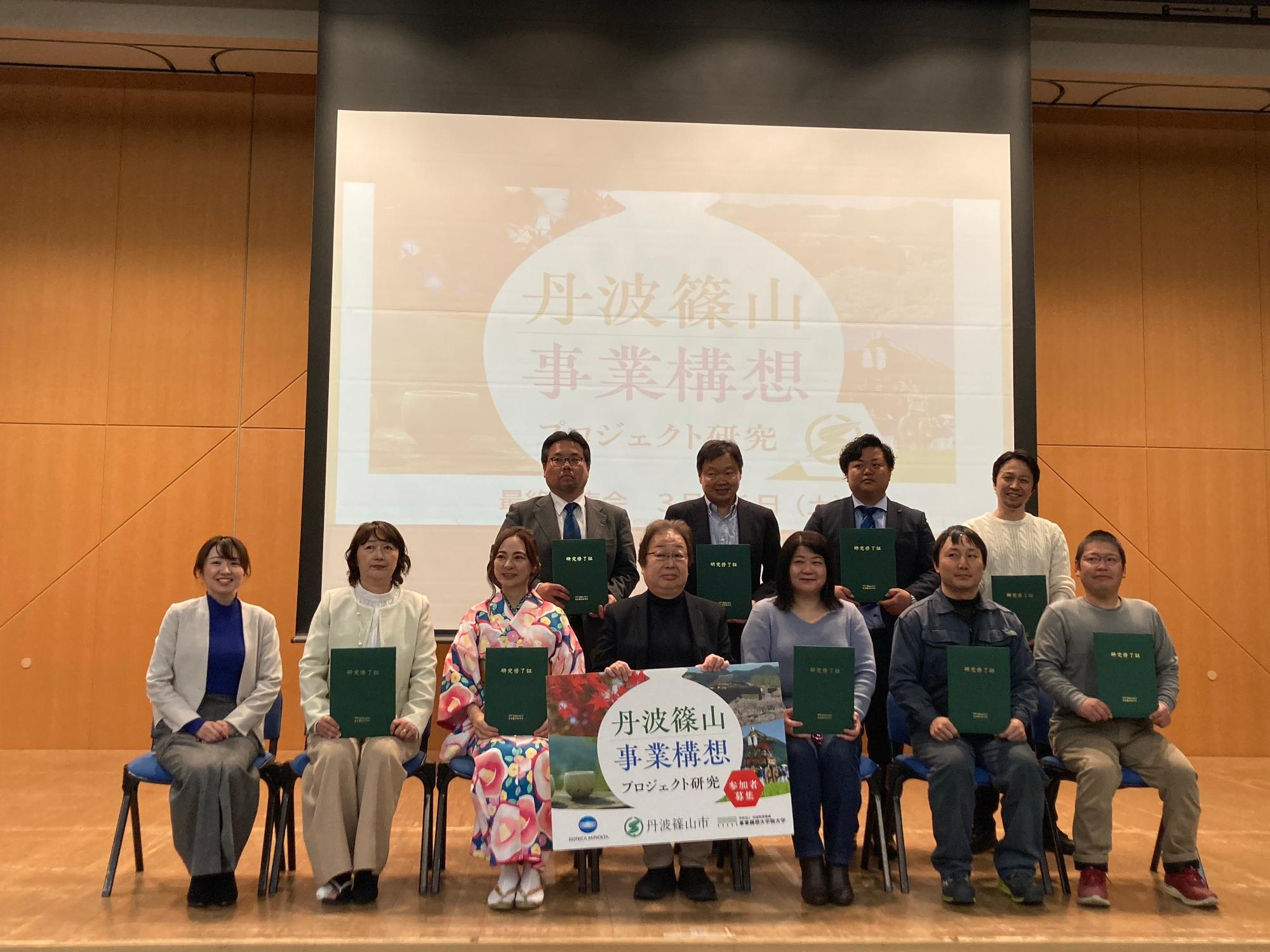 これは市のまちづくりをリードする人材を育成するため、市内外から選ばれた10名の研究員が丹波篠山市のことを学び、その資源を活かす事業を発表したものです。