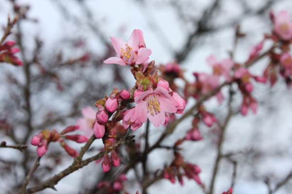 曇り空の下で開花している大山のオカメ桜の花と蕾がついた枝の写真 拡大画像 (JPEG: 110.6KB)