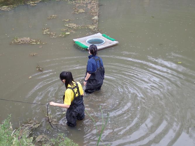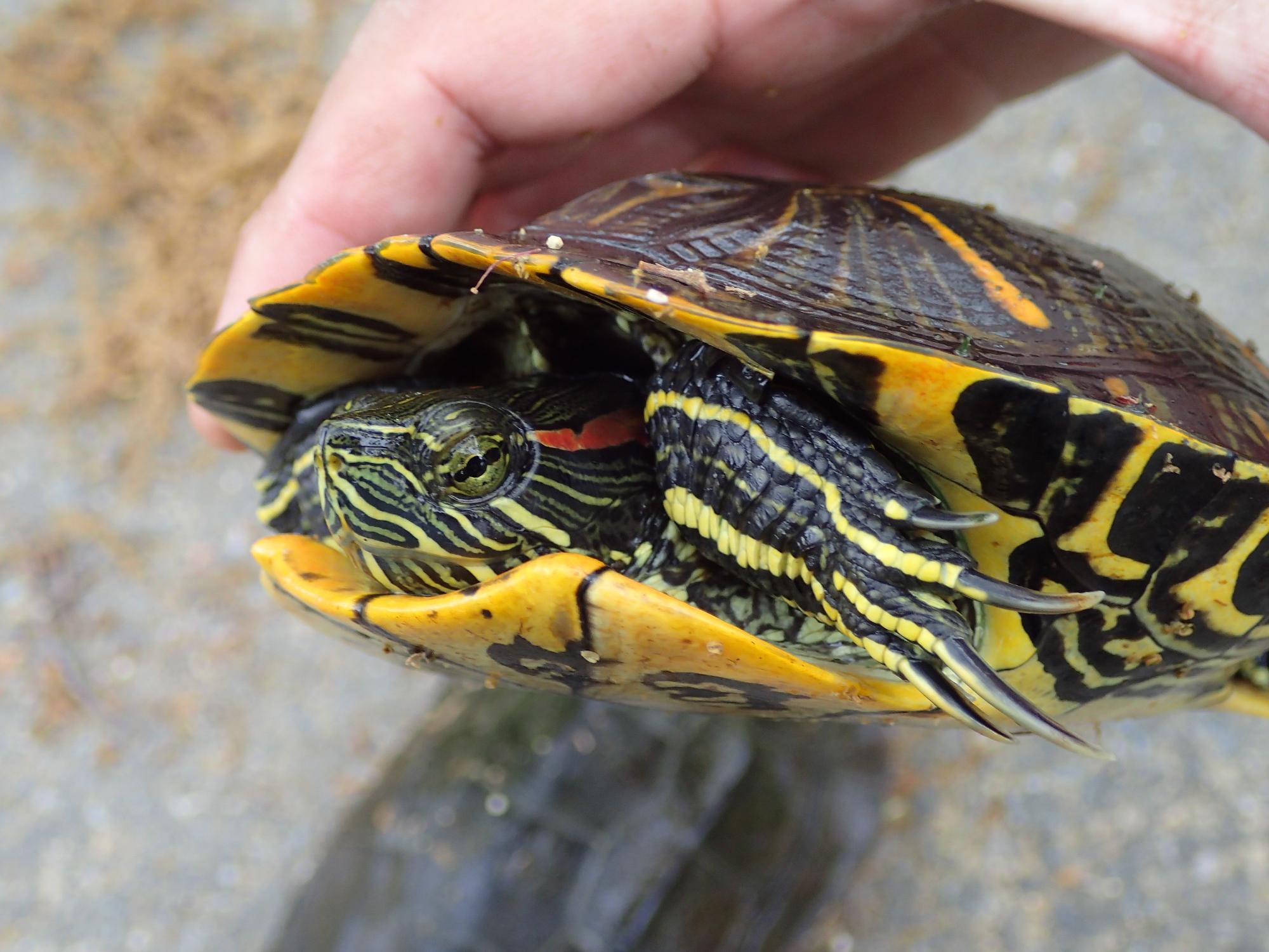 罠の引き上げは、月に一回の頻度で行っています。今月は、5月3日(日曜日)にカメ好きの親子にもご参加いただき、7匹のアカミミガメを捕まえました。