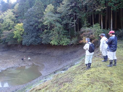 「かいぼり」とは、ため池の水を抜いて護岸にひび割れがないかをチェックしたり、泥かきをしたりする作業のことを言います。