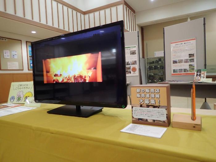 火をつけることができないので暖かさは体感していただけませんが、炎のゆらめきによる癒しだけでも感じられるように、薪ストーブの薪が燃える様子を映像で流しています。