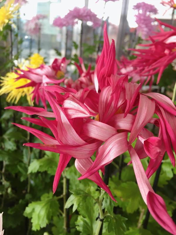 お苗菊は花弁が巻き上がる「狂い」が特徴的。市役所にお立ち寄りの際にはもみじも菊もお楽しみください!
