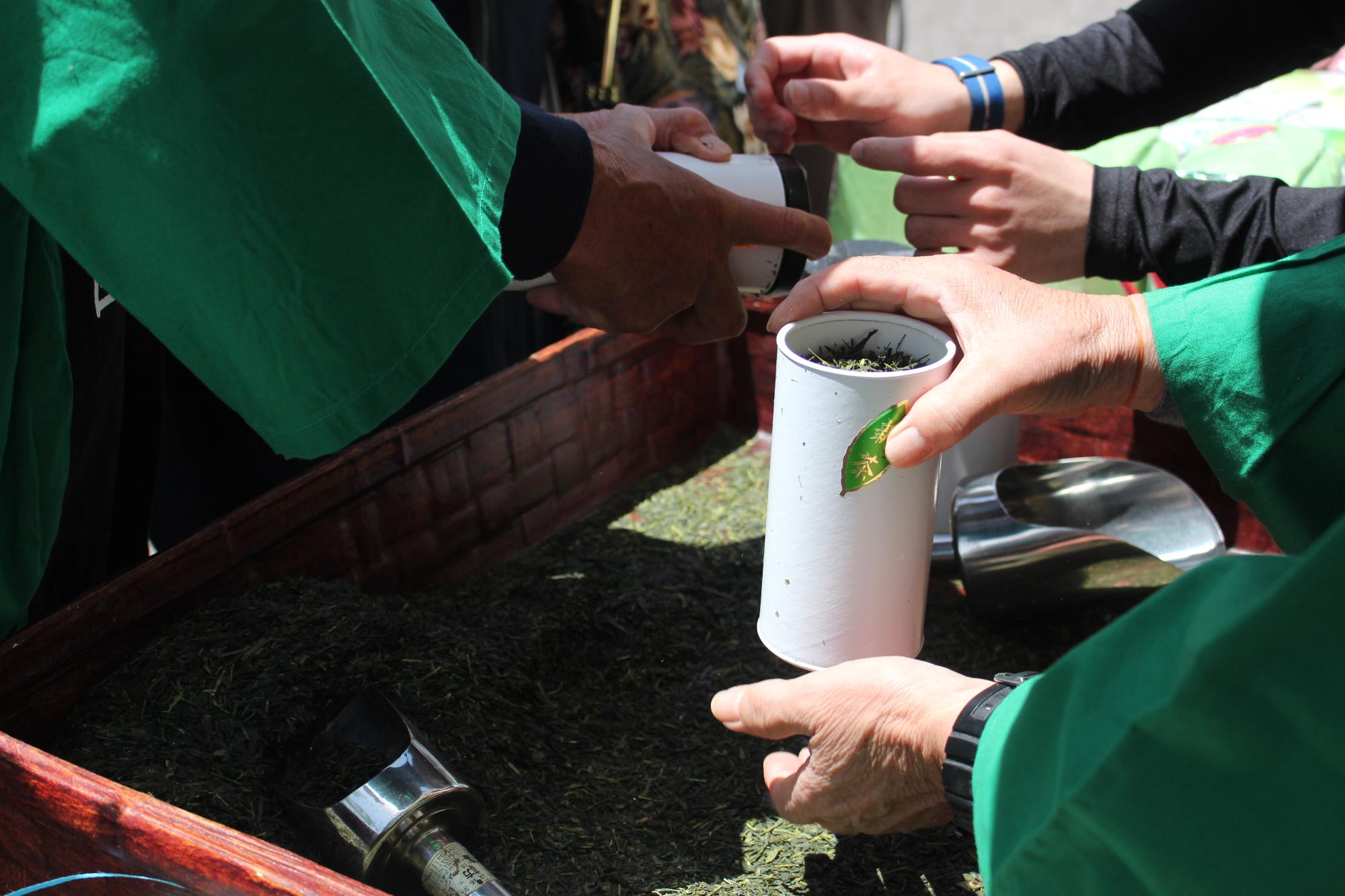 茶まつりでは、茶畑に入り茶摘み体験をする参加者の姿が見られました。