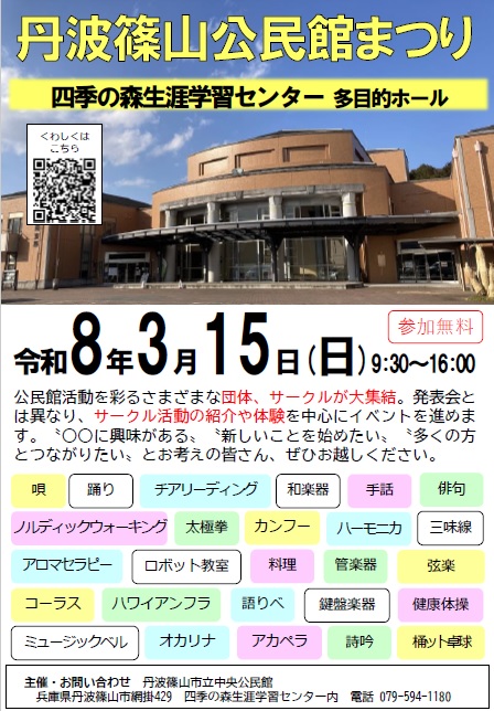 公民館利用団体等の活動紹介、活動体験の場を創出し、市民間交流や市民活動の活性化を目的に「丹波篠山公民館まつり2026」を開催します。