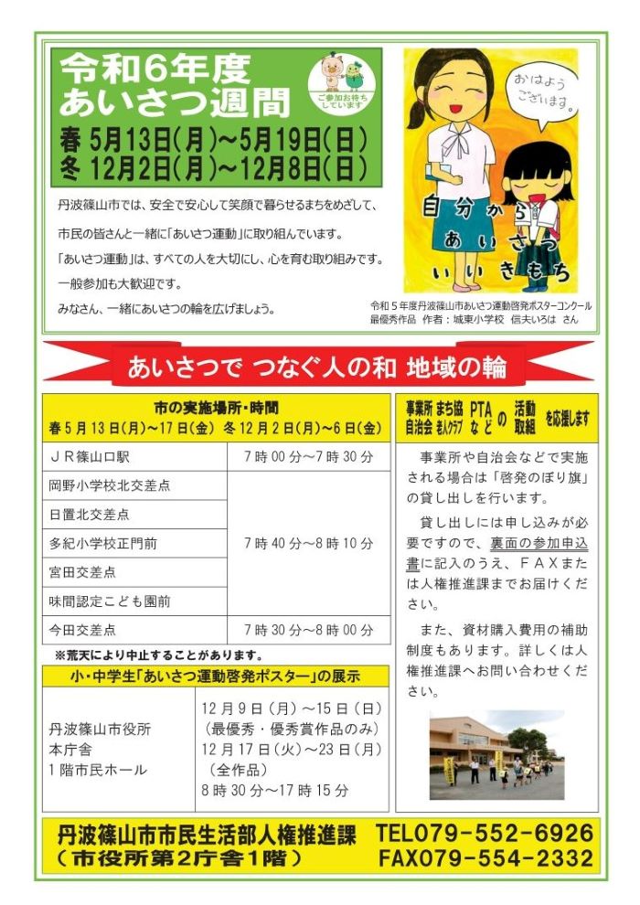 丹波篠山市では、12月2日から8日までを「冬のあいさつ運動強化週間」として、地域のみなさんと一緒に市内7カ所で街頭あいさつ運動に取り組んでいます。