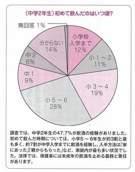 中学2年生が初めて飲酒をしたのはいつ頃か聞いたアンケートの調査結果のグラフ 拡大画像 (JPEG: 33.8KB)