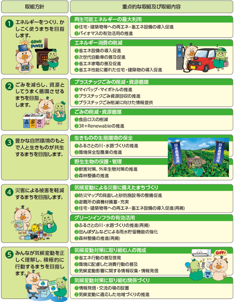 この計画は、環境と経済の好循環による脱炭素社会、循環経済、分散型社会への移行を目指し、温室効果ガス排出量の削減目標と再生可能エネルギーの最大限導入だけでなく、気候非常事態宣言を踏まえた5つの取組方針や環境保全型農業の推進、グリーンインフラの有効活用、ごみの削減・資源循環など10 の重点的な取組を設定しています。