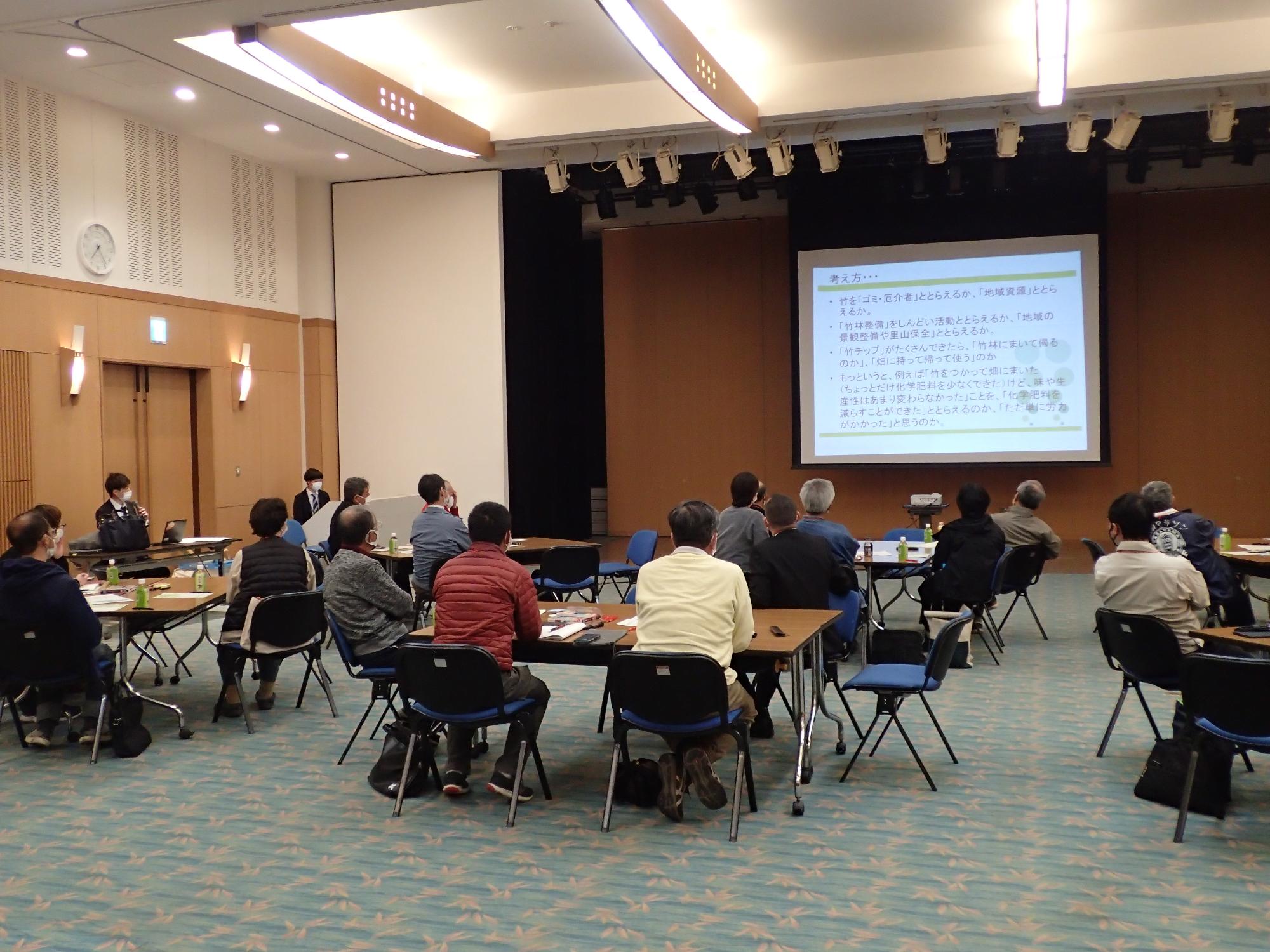 はじめに、丹波篠山市内の竹林の現状について、つづいて竹の利活用の事例について説明いただきました。