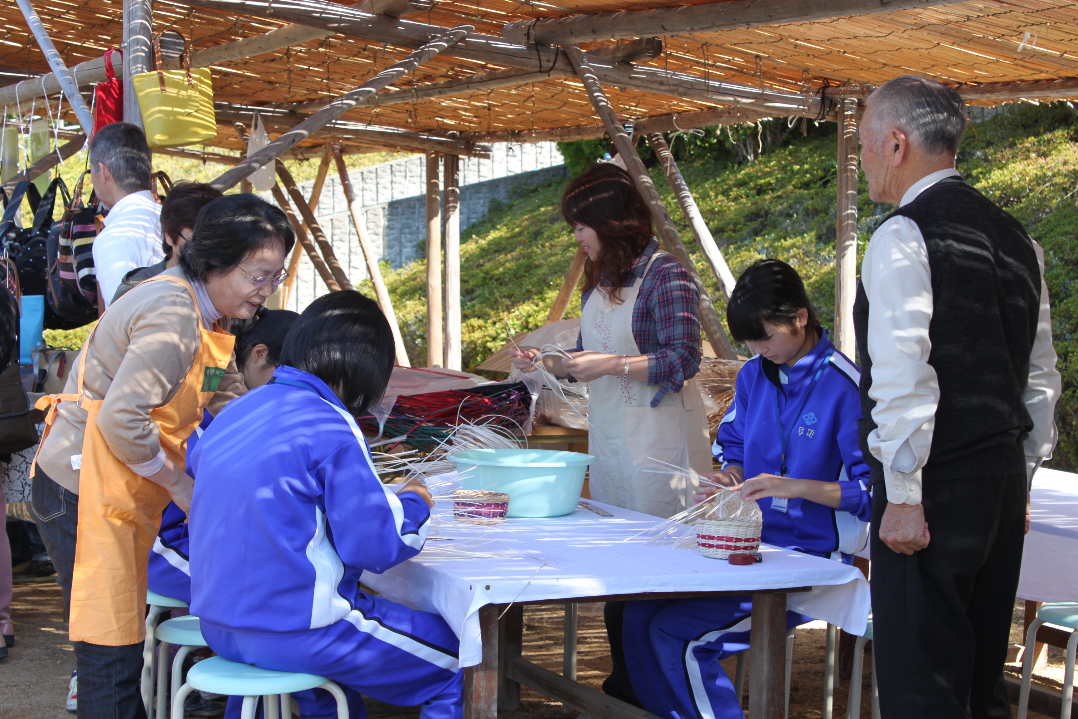 青色のジャージを着た生徒が網かごを作っており、学生に作り方を教えている方々の写真 拡大画像 (JPEG: 3.4MB)