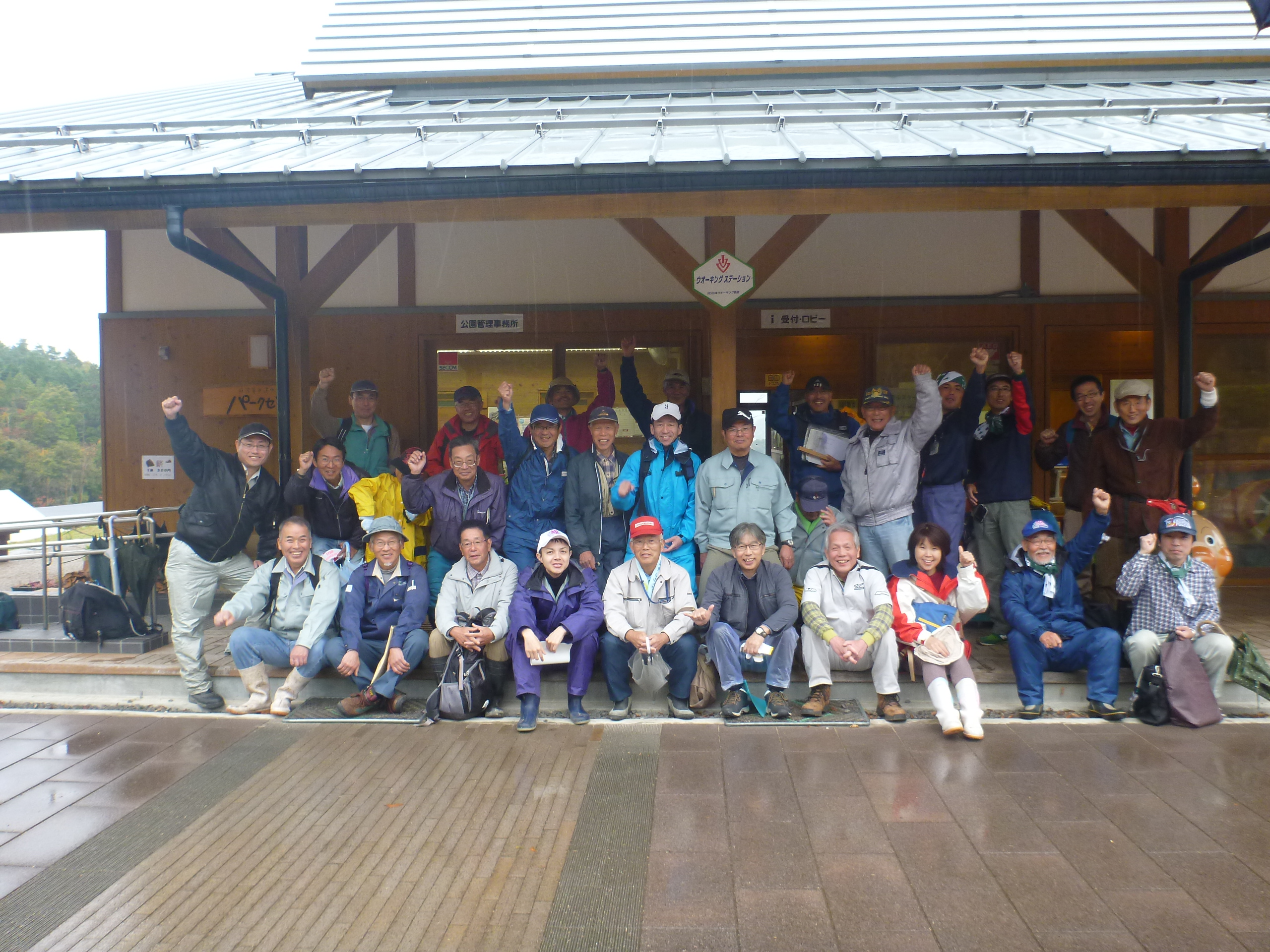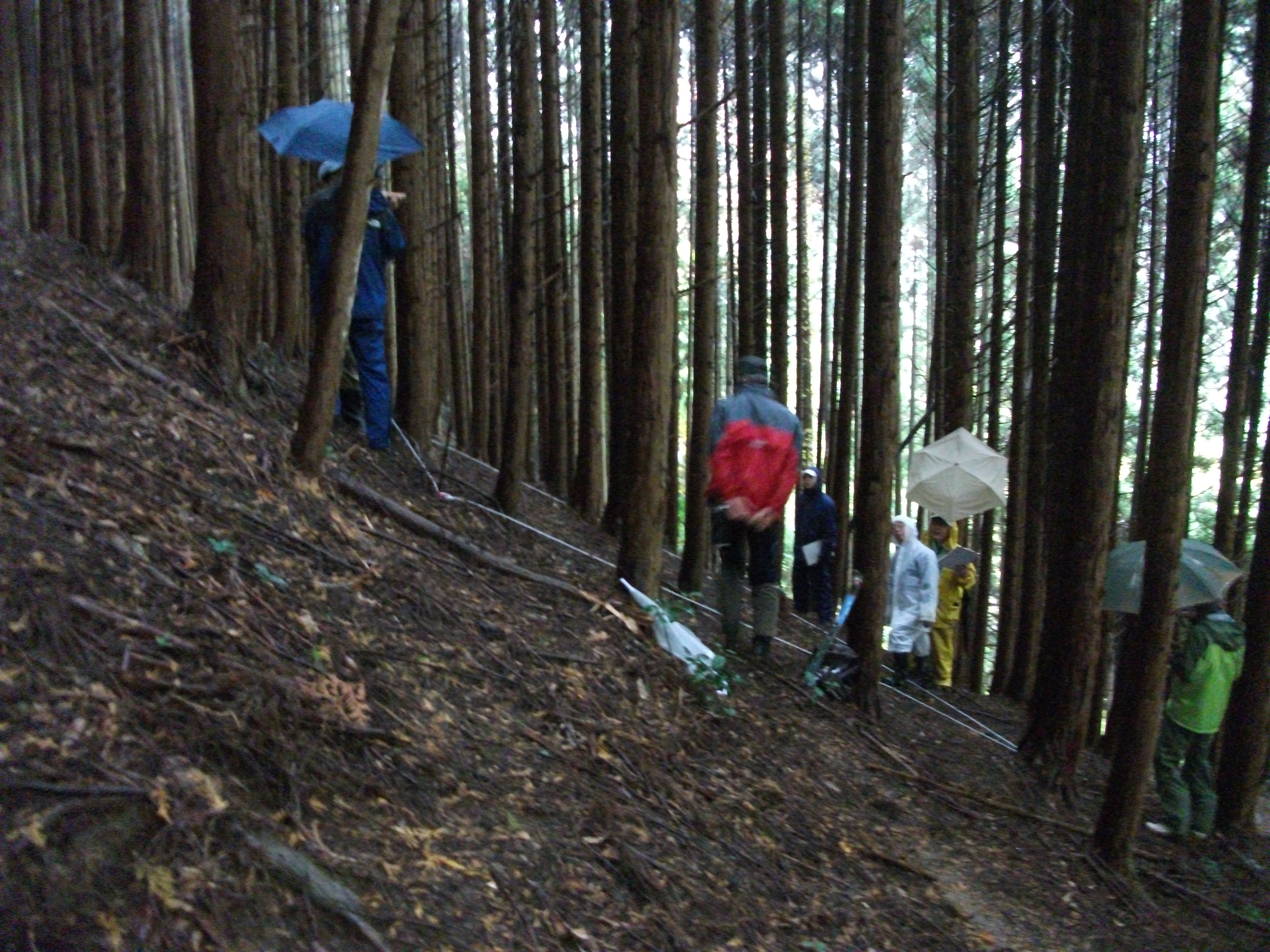 木々が生えている山の斜面を雨合羽を着て傘をさして登っている森の健康診断の参加者の写真 拡大画像 (JPEG: 2.5MB)
