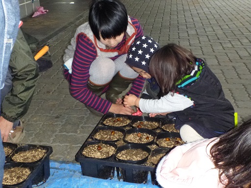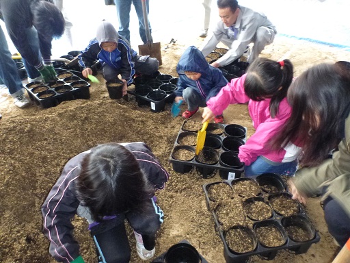 そして11月23日、その「子ども樹木博士」の子どもたちが森や里山で拾い集めたコナラやアベマキなどのどんぐりを育苗ポットに植えてもらい、自宅に持ち帰り苗木として育てる「どんぐりの里親」になっていただきました。