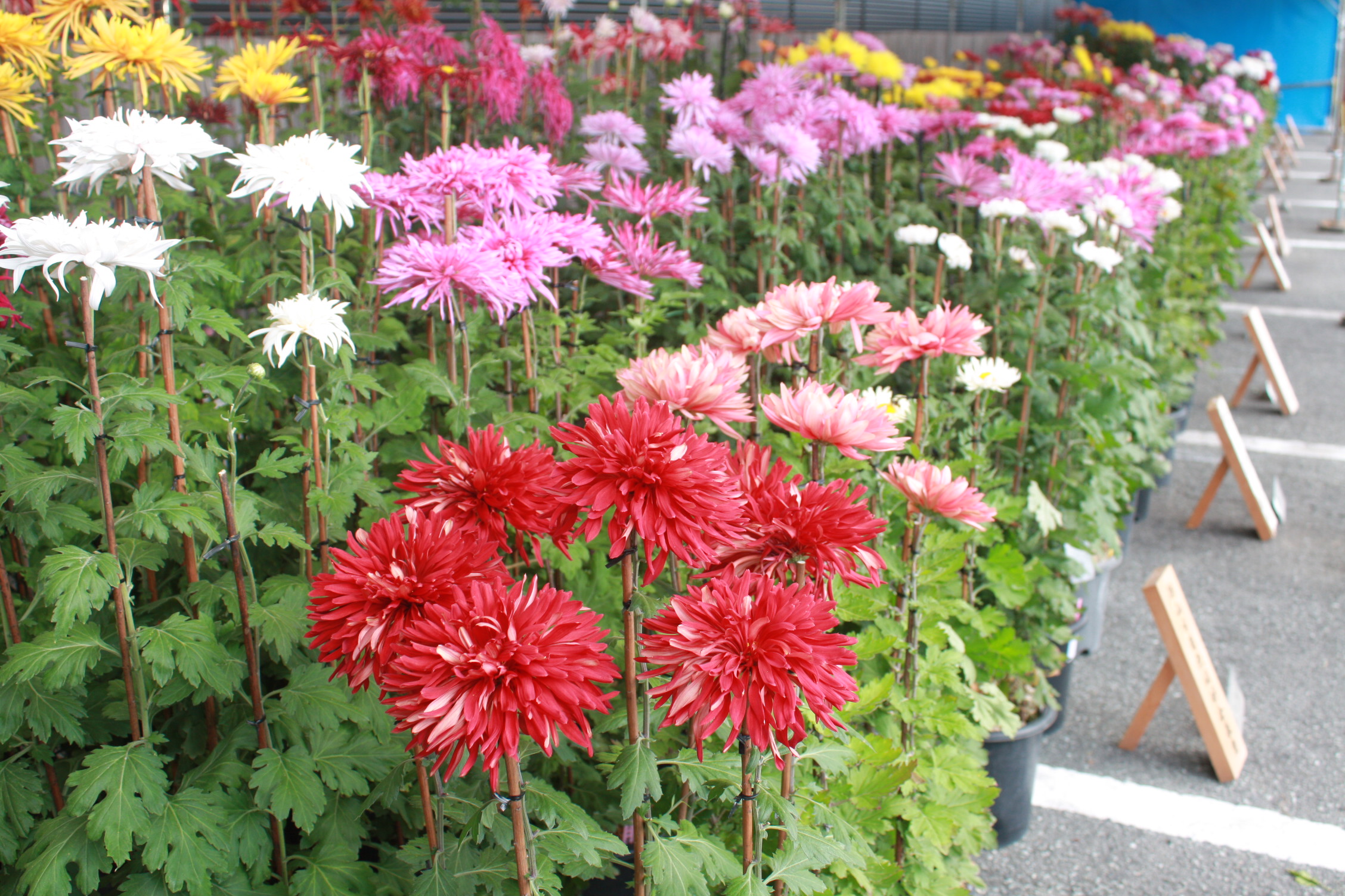会場の大手前南展示館前では、篠山市菊花同好会の会員が丹精込めて育てられた約400鉢の菊が色鮮やかに咲いています。