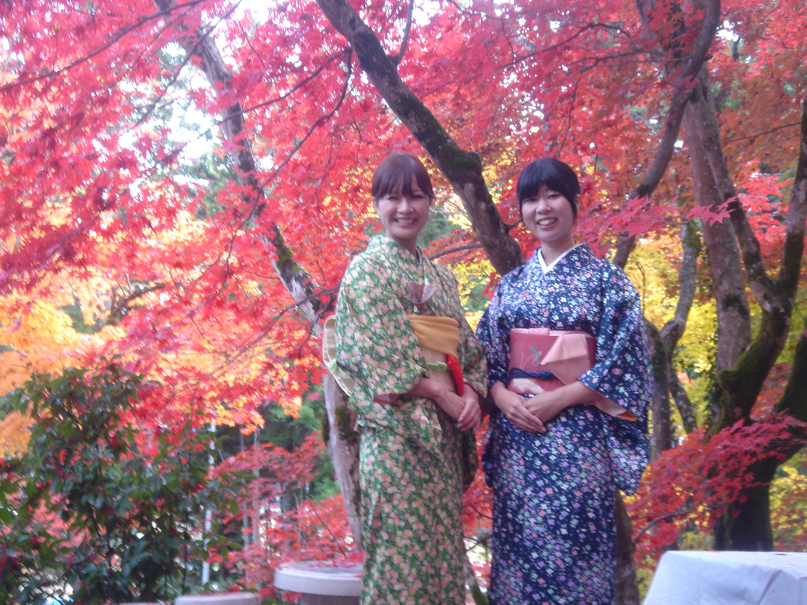 グリーンとブルーの着物を着た女性2人が、真っ赤な紅葉の前で記念写真 拡大画像 (JPEG: 2.2MB)