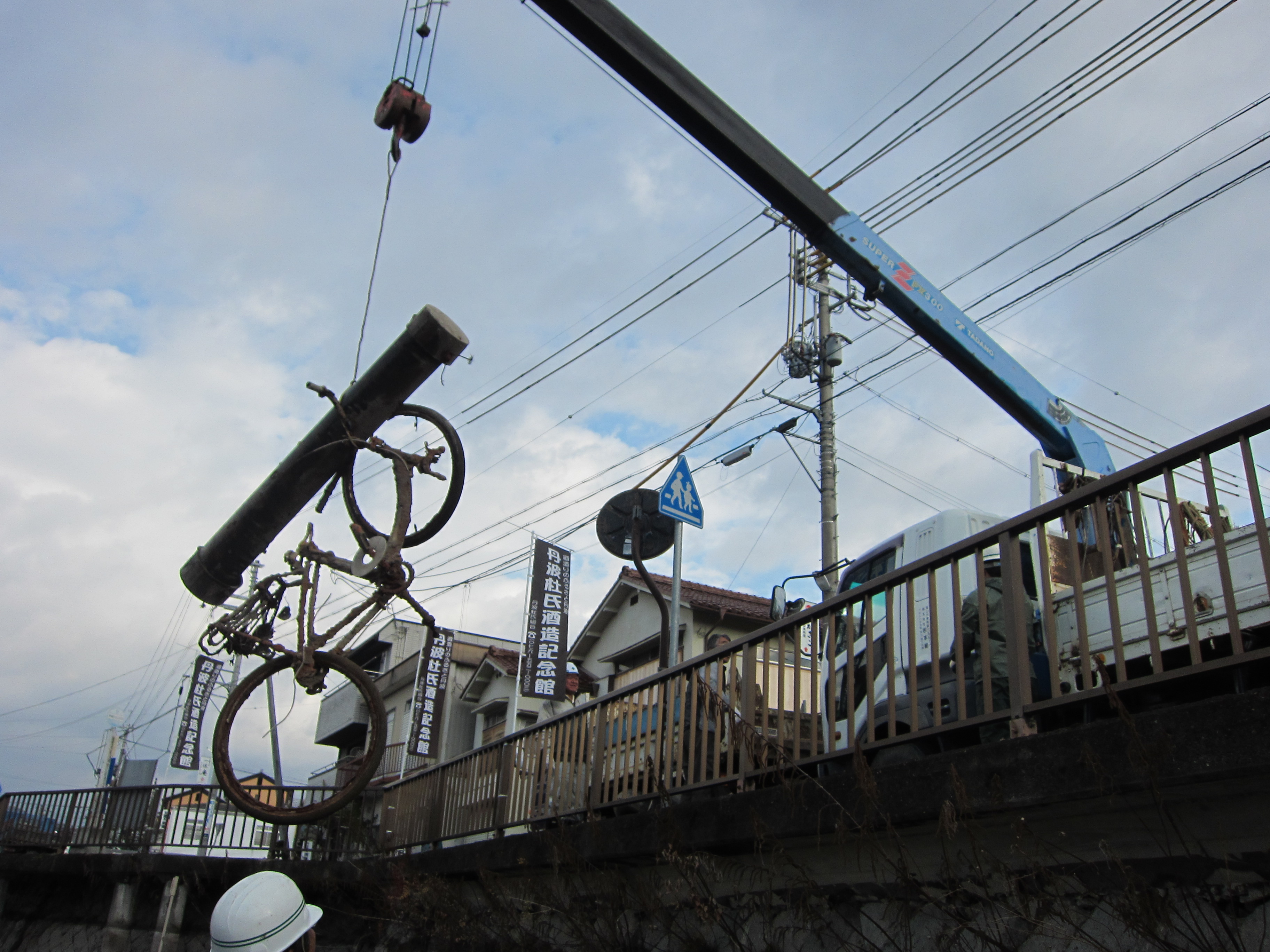橋の上から、クレーン車で自転車を吊り下げ回収している写真 拡大画像 (JPEG: 2.0MB)