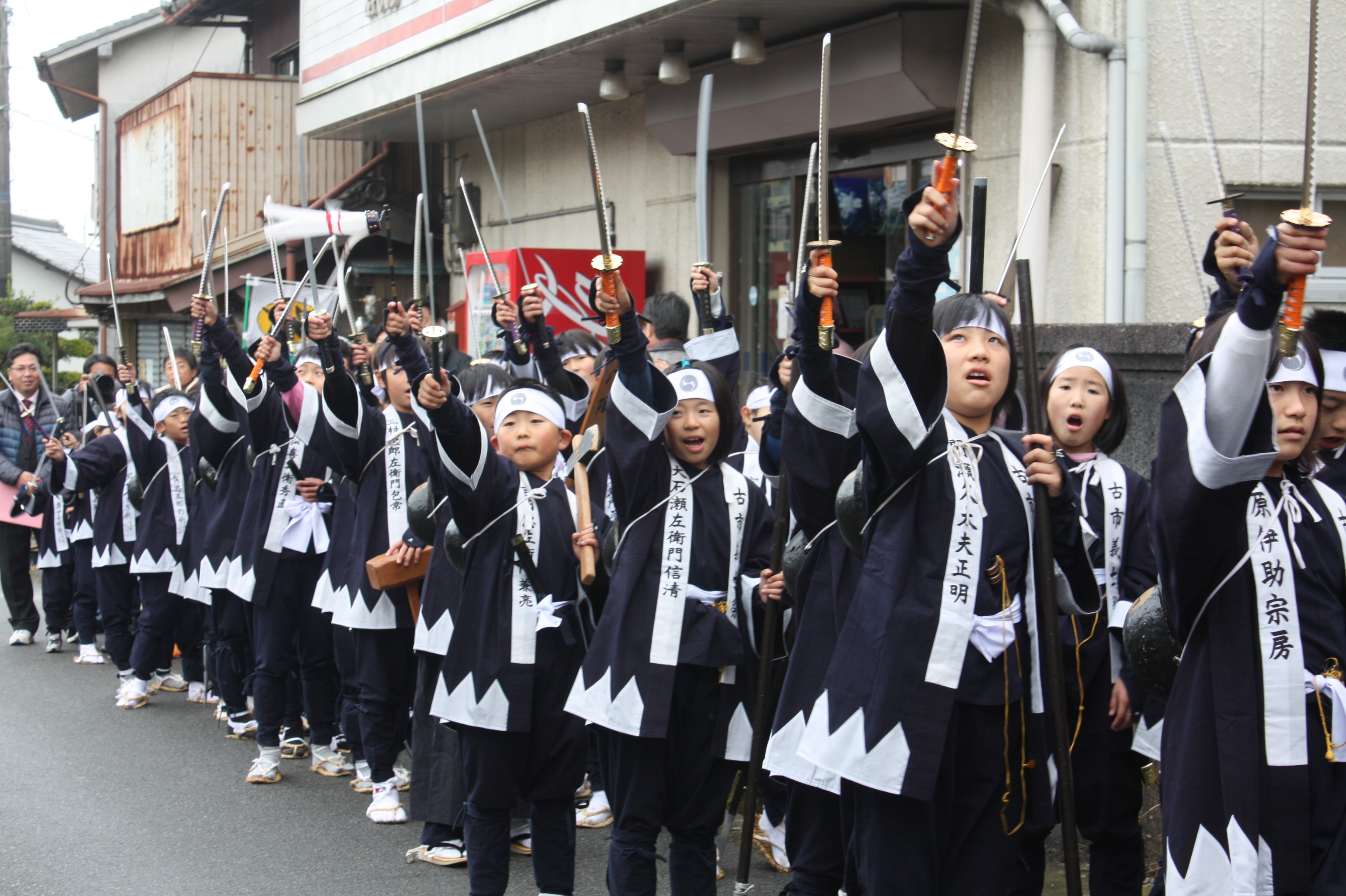 刀を上に振りかざしながら練り歩く子ども義士行列の写真 拡大画像 (JPEG: 2.3MB)