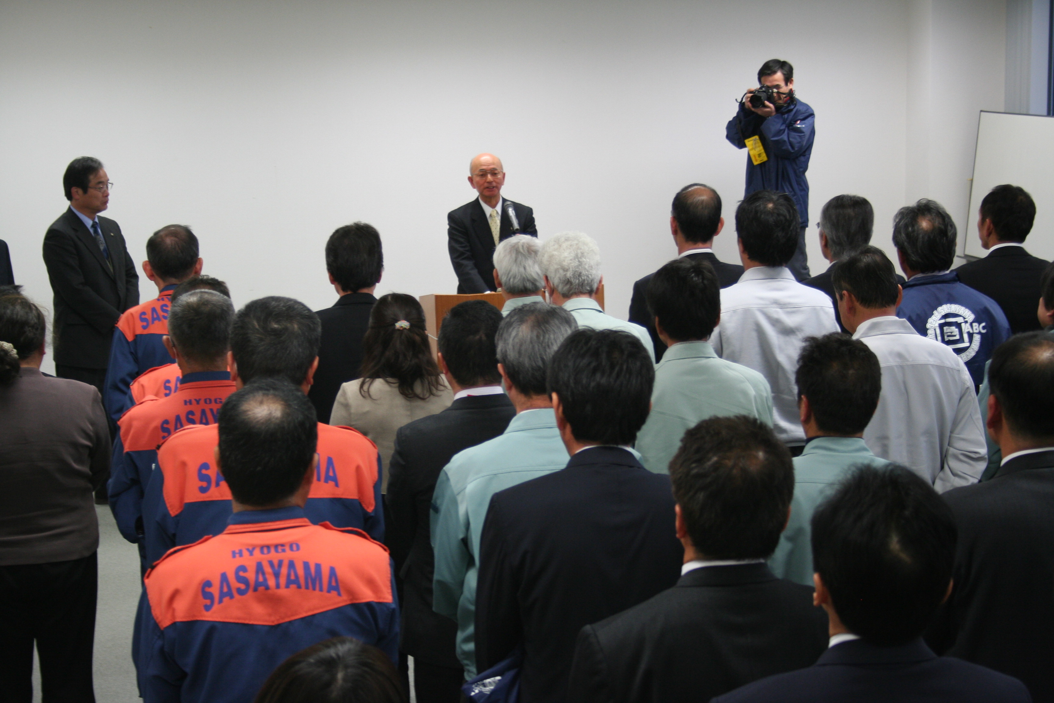 市長の話を整列して聞いている職員の写真 拡大画像 (JPEG: 1.2MB)