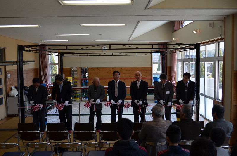 リングの前で畑地区にボクシングジム完成祝いで6名と市長がテープカットする写真 拡大画像 (JPEG: 114.5KB)