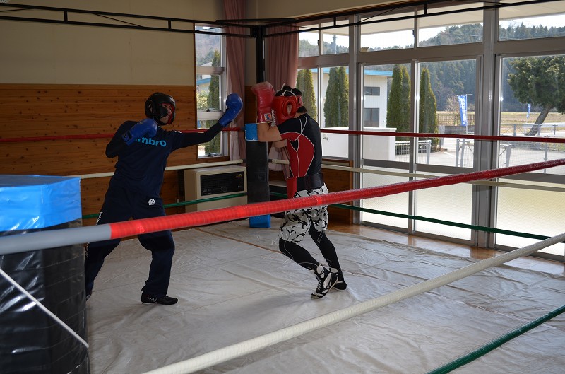 リングで左の青グローブの生徒が左アッパー、右の赤グローブの方がガードしている写真 拡大画像 (JPEG: 119.7KB)