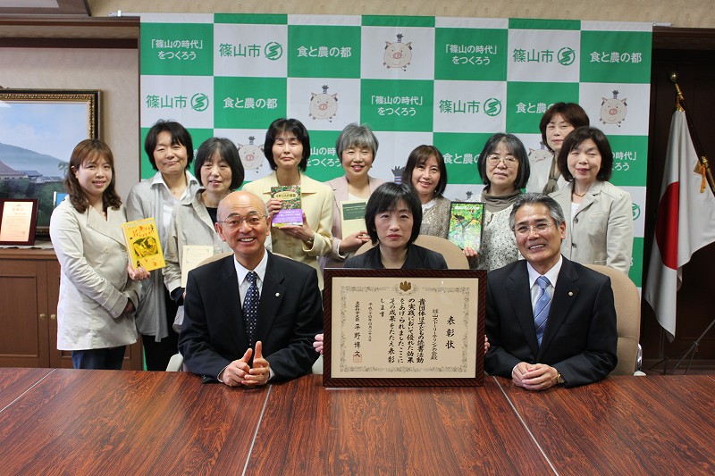 篠山市内在住の皆さんを中心につくる「篠山ストーリーテリングの会」(小山三智子代表、13人)が、子どもたちの読書活動を推進するために優れた取り組みを行っているとして、文部科学大臣表彰を受けられました。県内で表彰された団体は、「篠山ストリーテリングの会」と明石の「うさぎ文庫」の2団体。東京での表彰式(4月23日)を終えられた4月25日、その報告も兼ね表敬訪問いただきました。