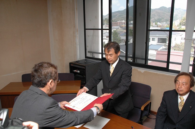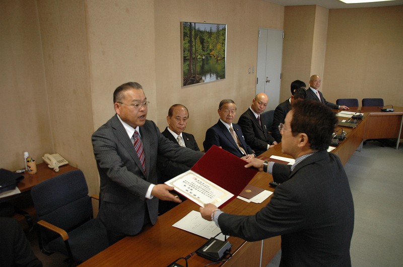 植村 みつる議員がグレーのスーツを着た男性から証書を手渡しでもらっており、横に座っている男性の方々が見守っている様子の写真 拡大画像 (JPEG: 89.1KB)