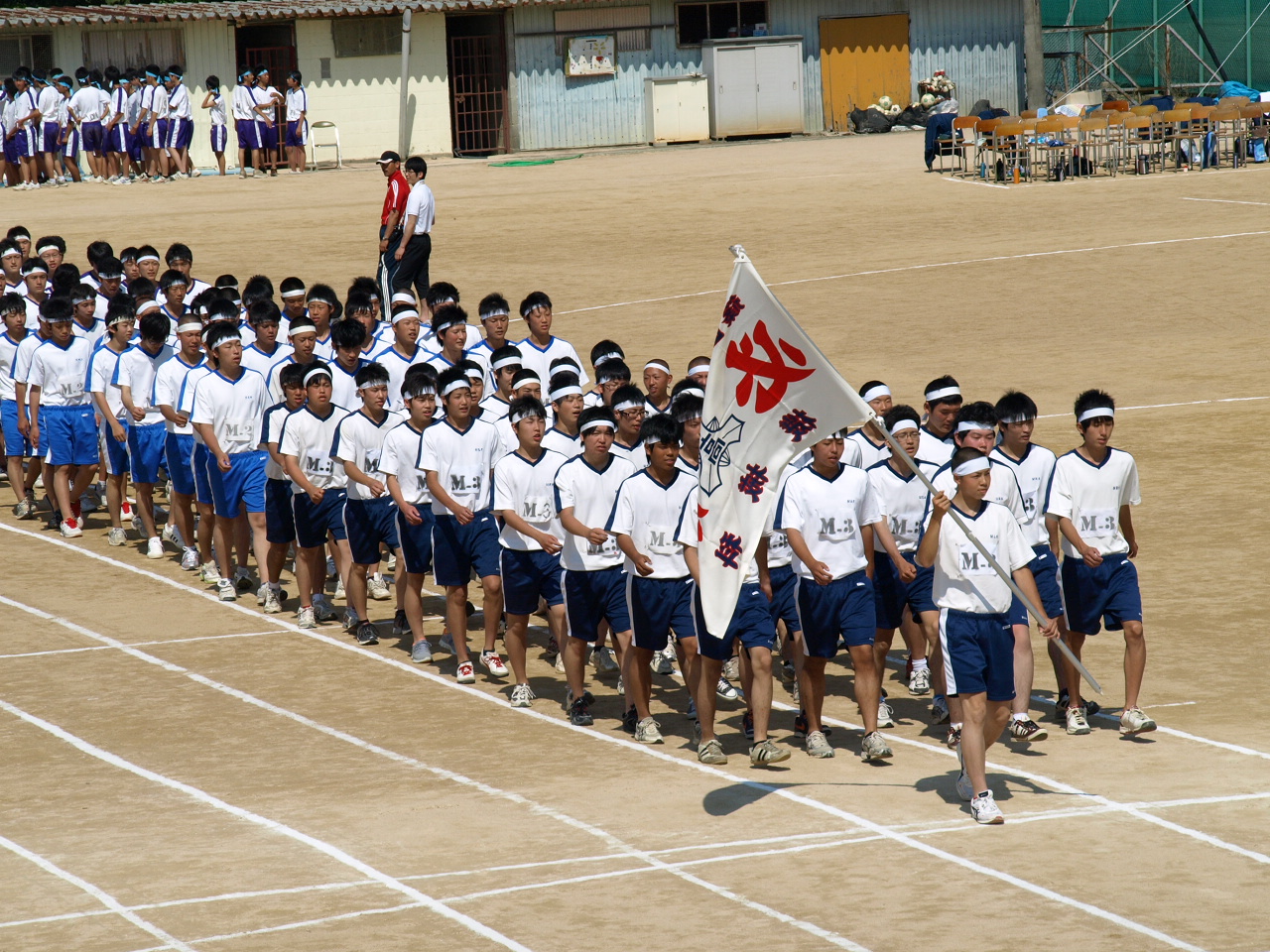 篠山産業高等学校の体育祭の開会式で白色の鉢巻きをして団旗を両手に持った男子を先頭に一斉に行進している写真 拡大画像 (JPEG: 574.1KB)