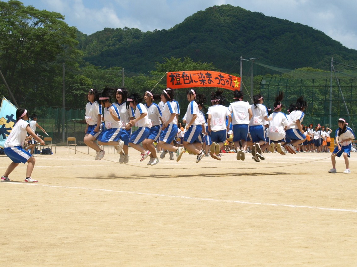 長縄跳びの競技で女子生徒が一斉に飛んでいる写真 拡大画像 (JPEG: 246.0KB)