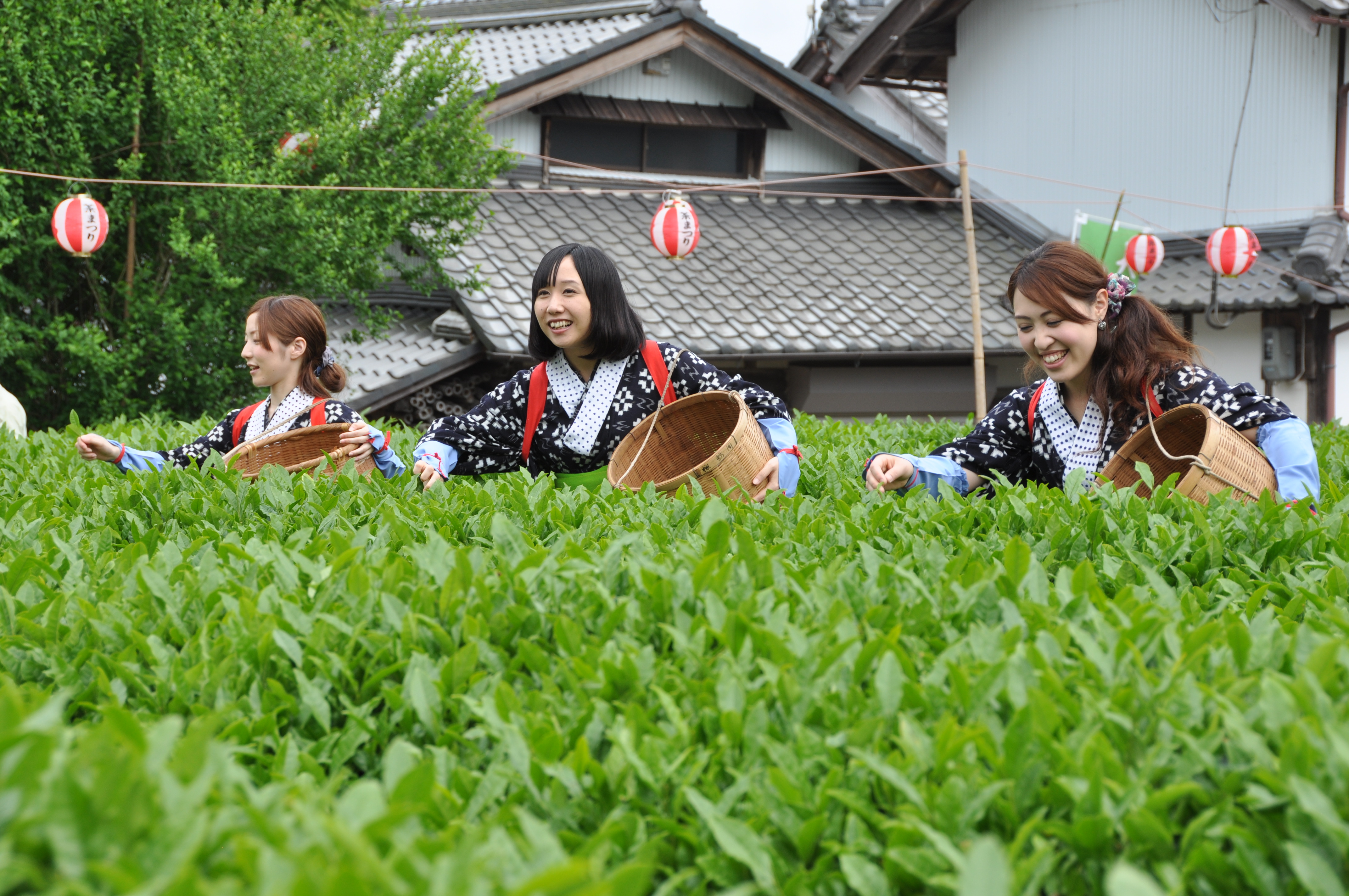 茶摘み娘の衣装を着た3人の女性が、茶畑の中で笑顔で茶摘みをしている様子の写真 拡大画像 (JPEG: 3.1MB)