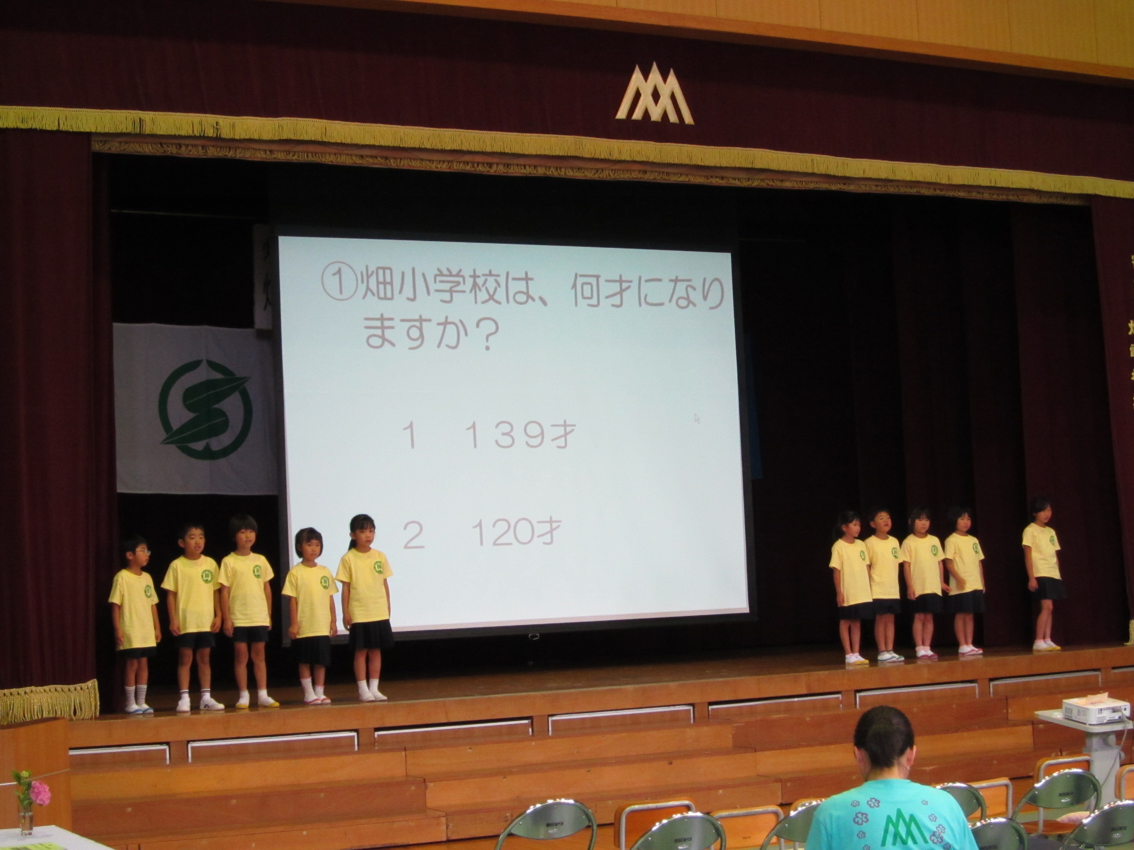 畑小学校創立139周年記念式典が行われている体育館の舞台に生徒たちが3列に並んでおり、前列の生徒たちが一文字ずつ書かれている画用紙を持って写っている写真 拡大画像 (JPEG: 864.3KB)