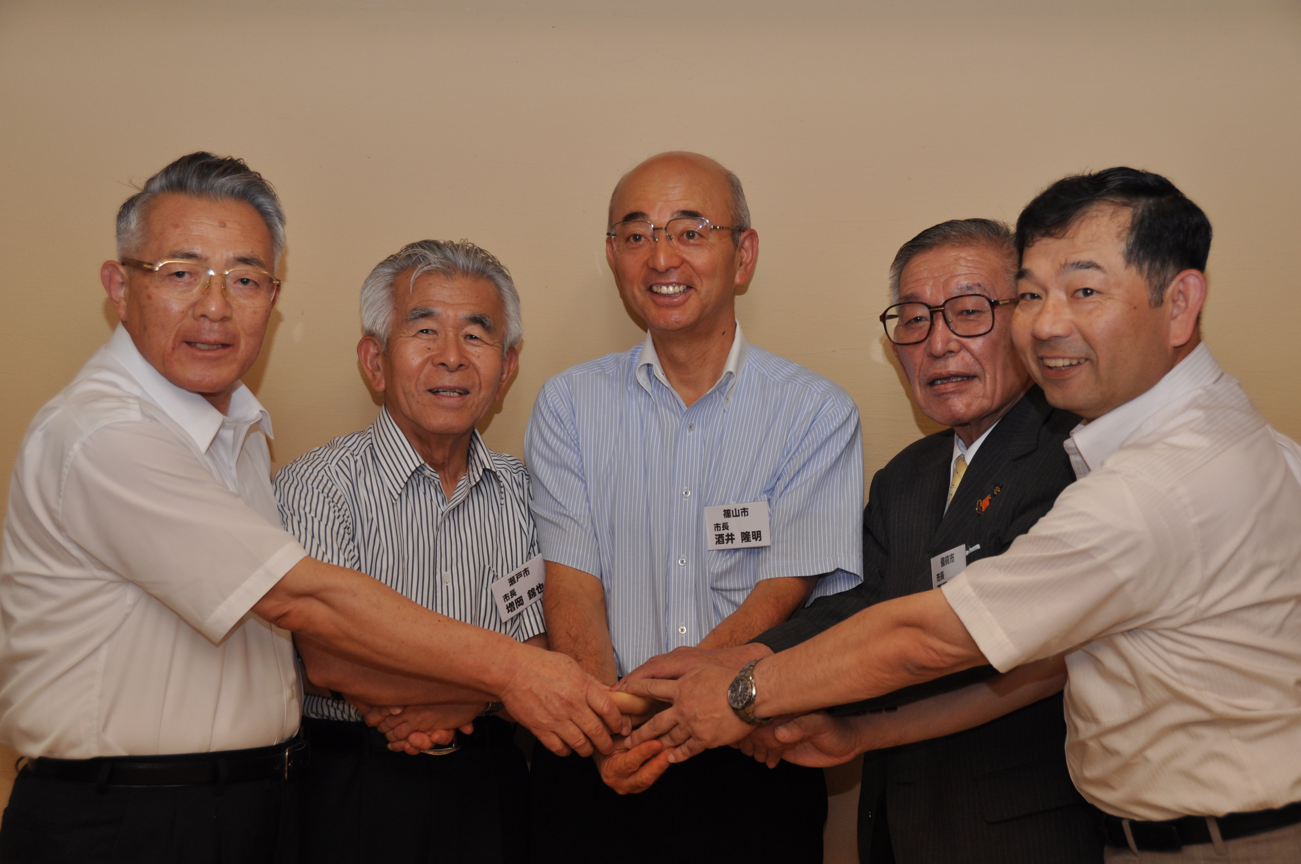越前町 関町長、瀬戸市 増岡市長、篠山市長、備前市 西岡市長、常滑市 片岡市長が手を重ねて結束を固めている写真 拡大画像 (JPEG: 4.6MB)