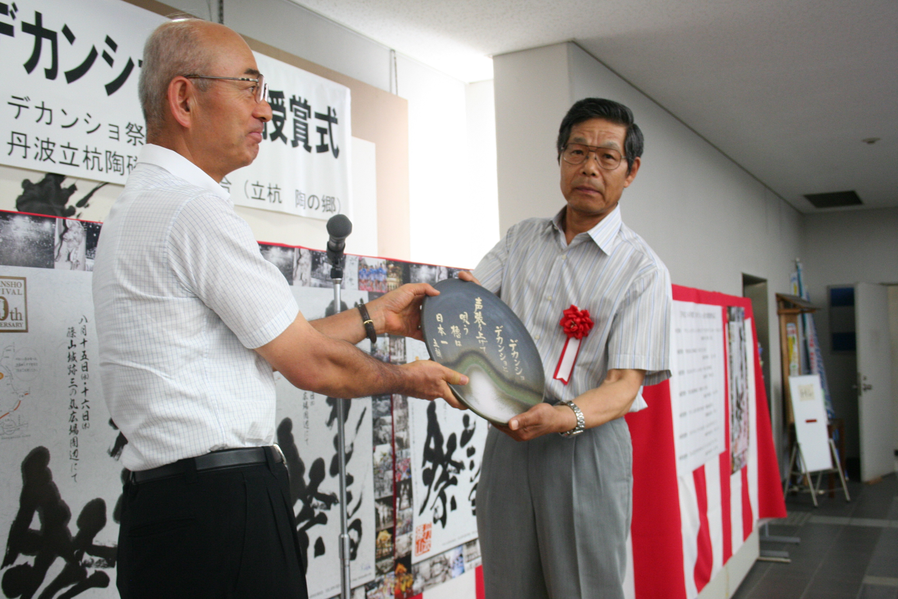 日本デカンショ節大賞授賞式にて大賞の尾川さんが、市長からまるいプレートを受け取っている写真 拡大画像 (JPEG: 1.5MB)