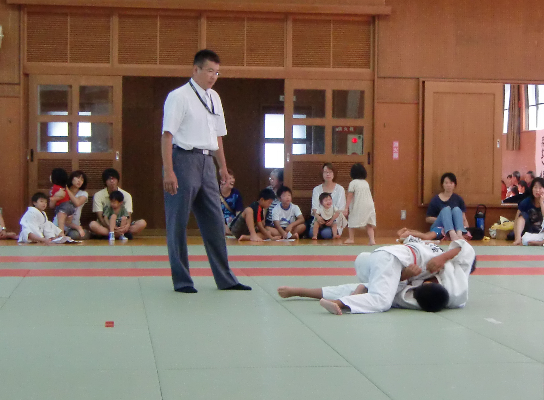 畳の上で柔道をしている2人の少年とその横に審判、その後ろに応援する人たちが映っている写真 拡大画像 (JPEG: 1.2MB)