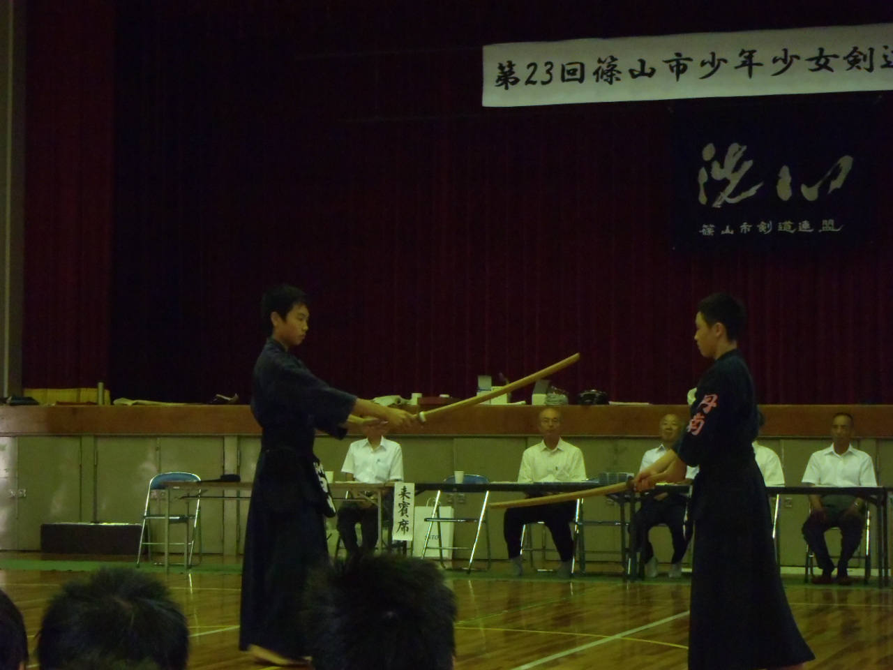 体育館の中で4名の男性が座っていて、その前で剣道着の姿の少年2名が竹刀を持って向かい合わせで立っている写真 拡大画像 (JPEG: 283.8KB)