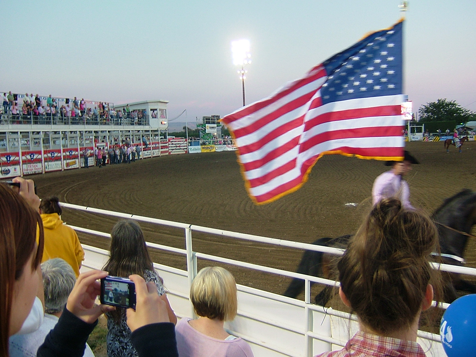 男性がアメリカの国旗を手に持ち、馬に乗っているところを観客が見ている写真 拡大画像 (JPEG: 586.8KB)