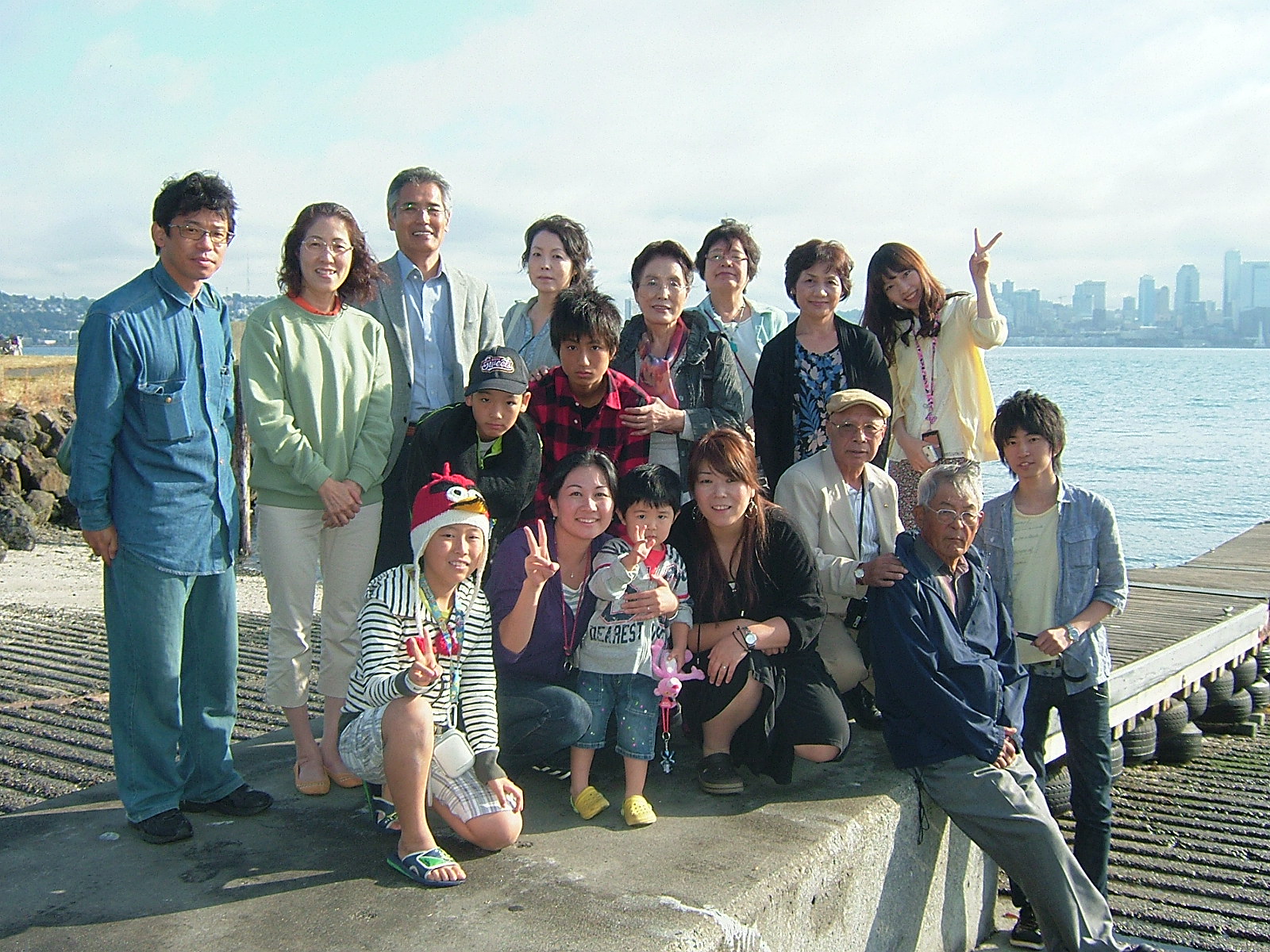 広い川の前で男性、女性、子供達17人みんなで一緒に集まりピースをしたり笑顔の集合写真 拡大画像 (JPEG: 589.9KB)