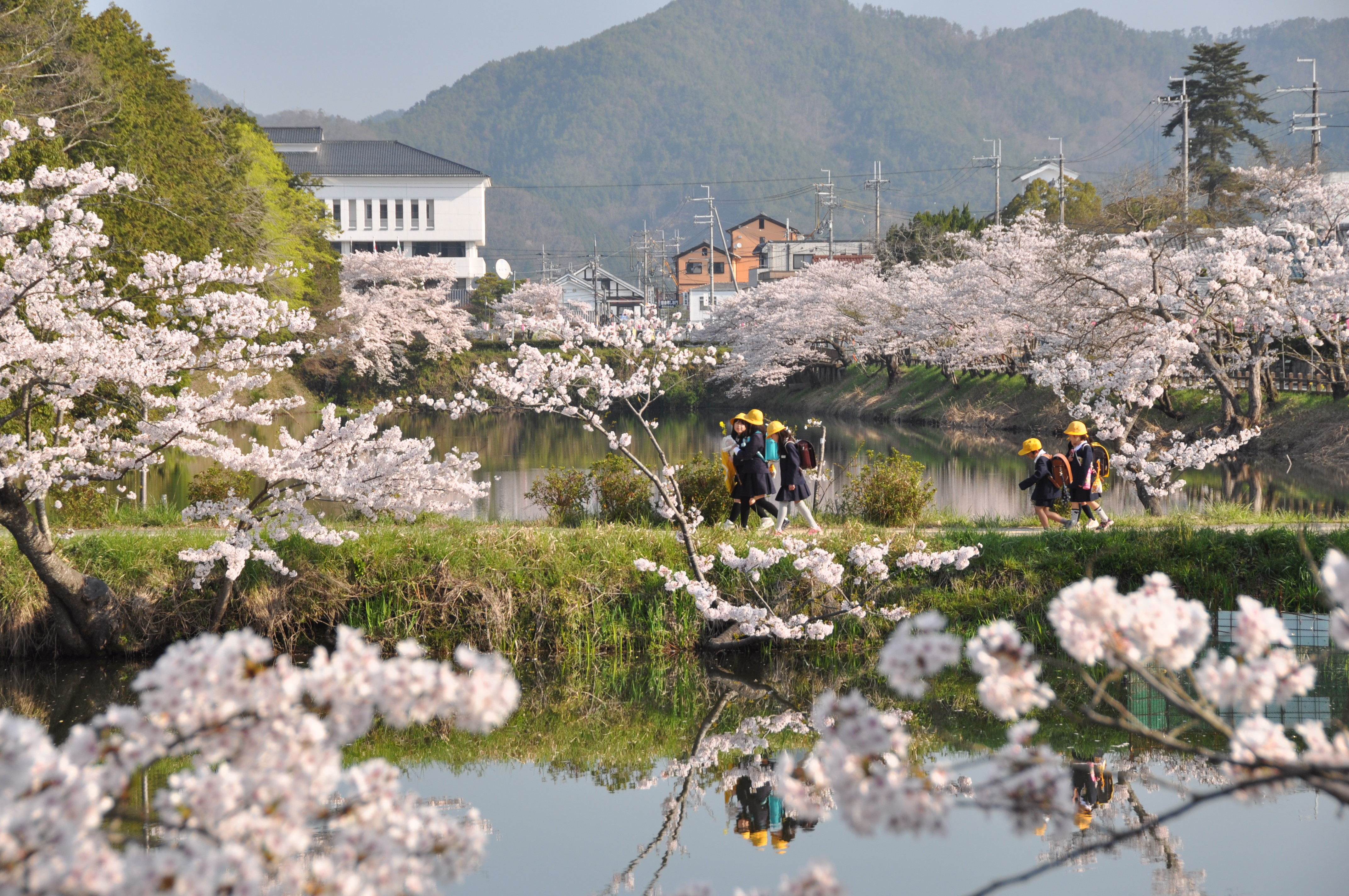 桜満開のお濠での登校。1年生かな?遅れないよう懸命についていく姿が微笑ましい春の風景。文化財を大切にしている篠山城跡の景観です。(篠山城跡)