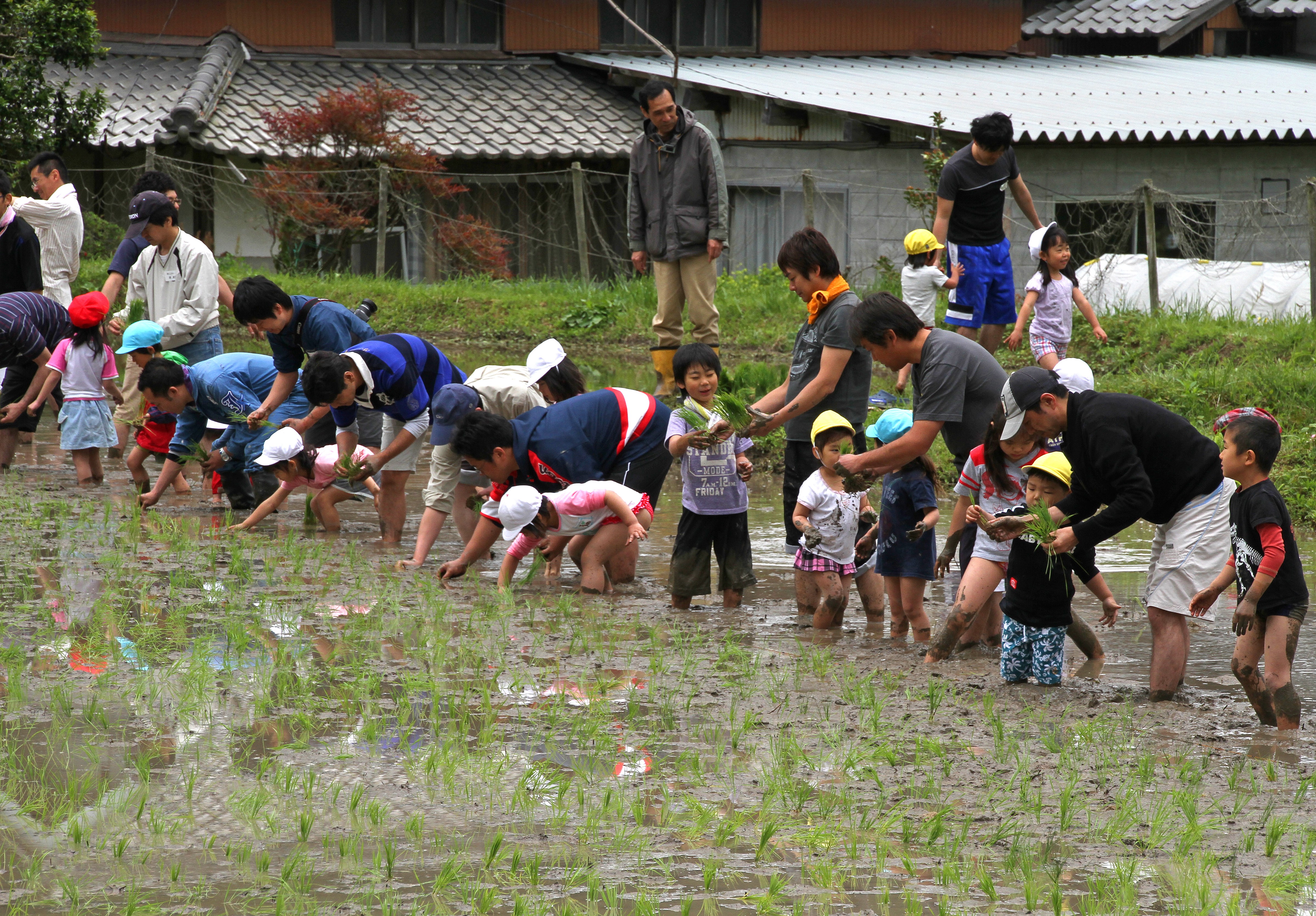 田植えの時期に篠山を訪れると、市内の学校などから田植えの体験学習に来ているのを見かけることがある。この時も宝塚から来たという園児達が田植え体験をしていた。このような交流を通じて篠山市の良さを色んな人達に知ってもらうことは良いことだと思える。(栗柄)