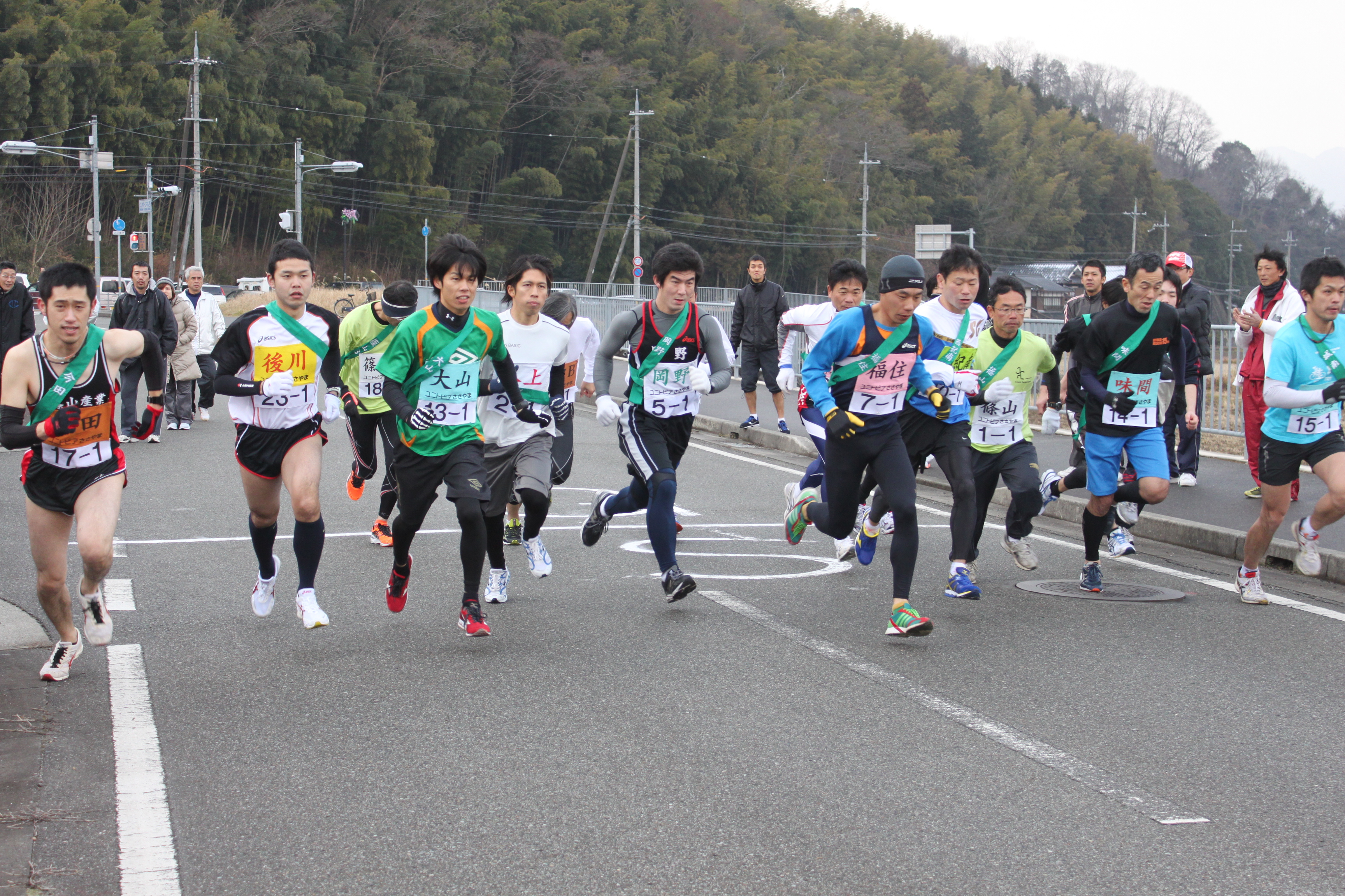 1月20日(日曜日)、黒豆の館発着コースで、市内13地区17チームが参加して新春駅伝が開催されました。レースは大山チームが先行する昨年優勝の福住チームを3区で逆転し、2位に50秒をつけ、初優勝を飾りました。2位は福住、3位は今田Aでした。
