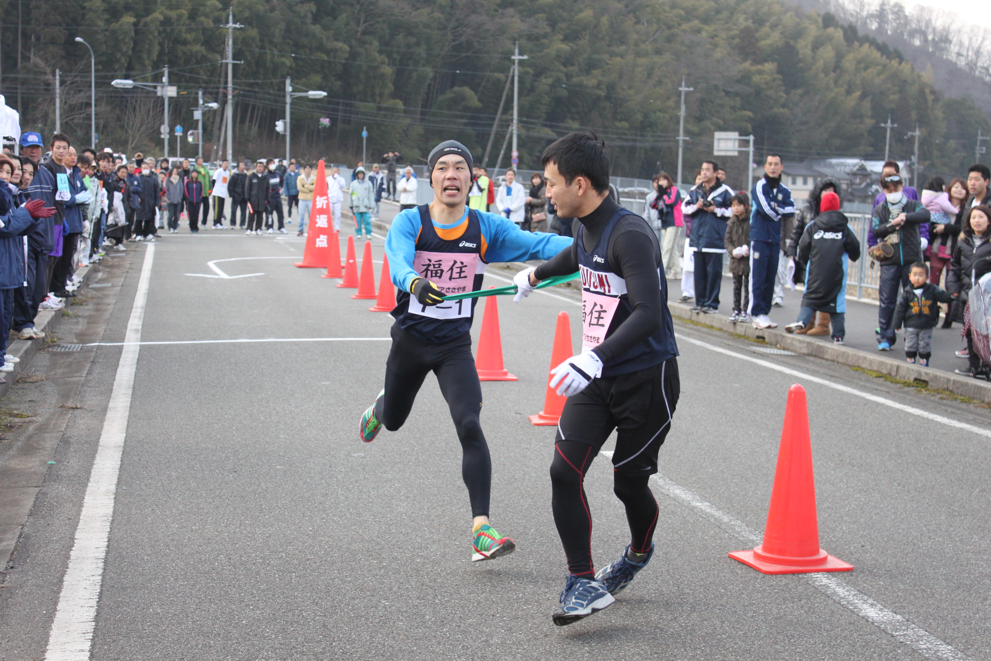 福住と書かれたゼッケンのユニフォームを着た男性が、緑色のたすきを次のランナーに渡している写真 拡大画像 (JPEG: 4.0MB)