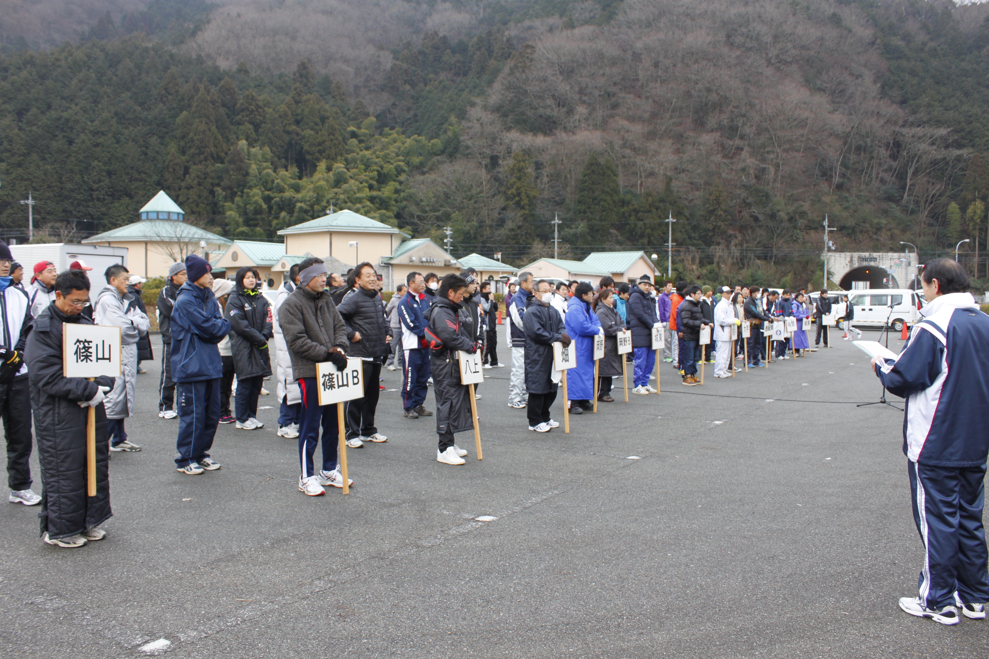 防寒着を着て整列する、市内のさまざまところからの参加者の写真 (JPEG: 4.1MB)