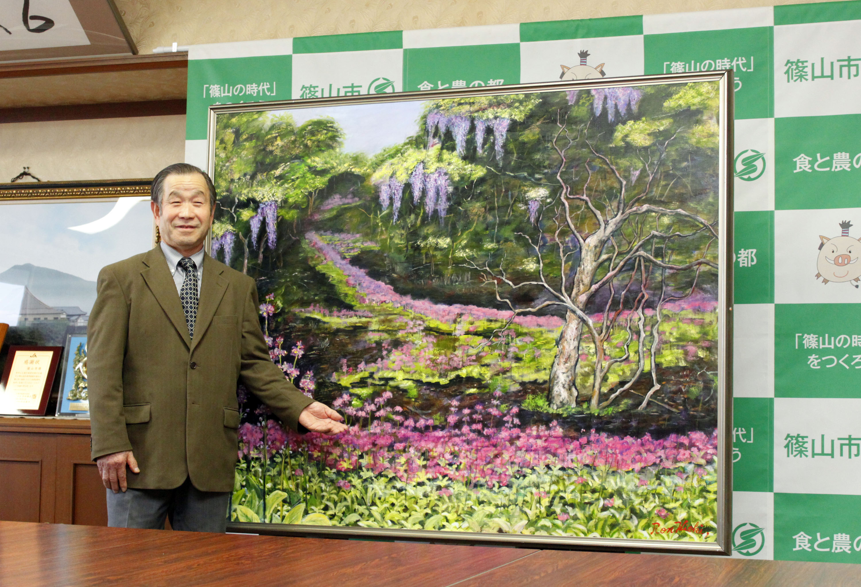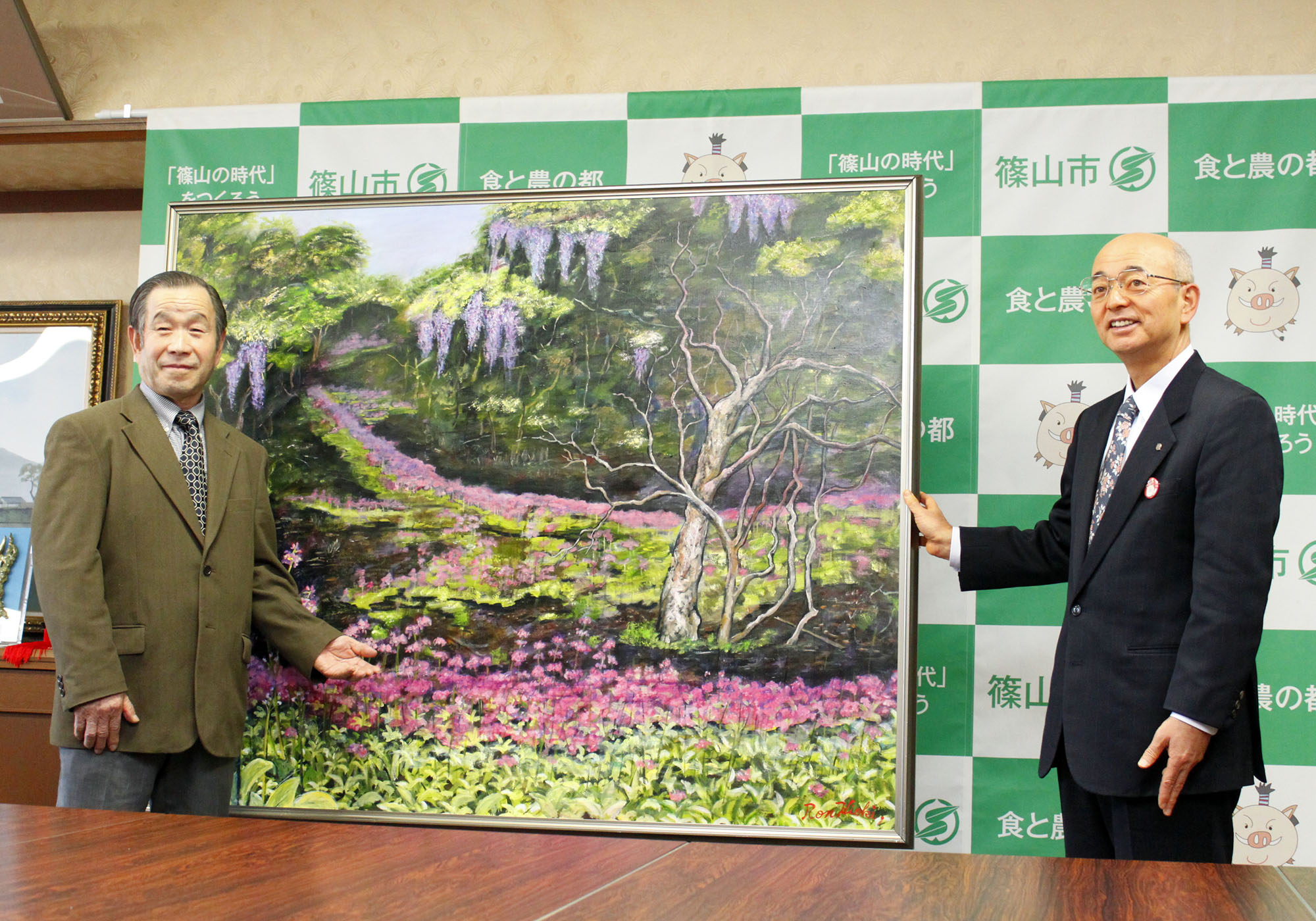 篠山市出身の画家・火置 弘さんと市長で、洋画「夢幻(むげん)」と記念写真 拡大画像 (JPEG: 544.4KB)