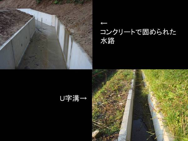 左コンクリートで固められた水路、右U字溝の写真 拡大画像 (JPEG: 34.8KB)