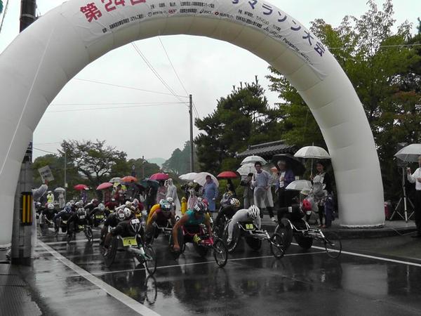 雨の降る中、車いすマラソンスタートの写真 拡大画像 (JPEG: 49.3KB)