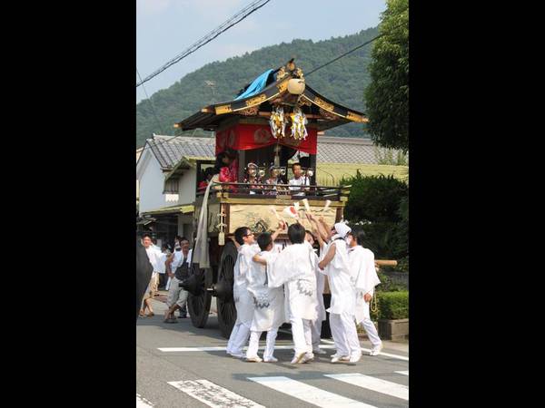 白い衣装を着た男性が神輿を担いでいて、神輿の中に子供が座っている写真 拡大画像 (JPEG: 31.2KB)