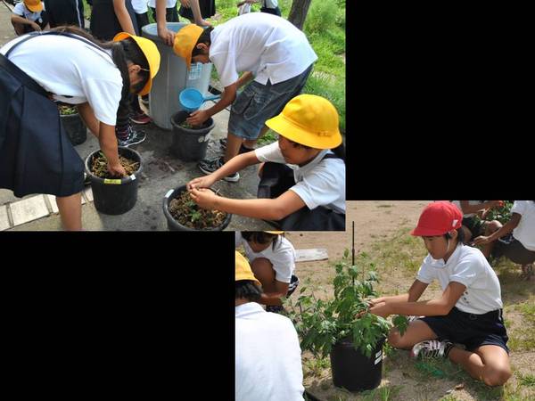 里山グループでは、いろいろな里山での遊びやカブトムシの幼虫の飼育などに取り組み、田んぼグループでは、全校生で田植えや稲刈り体験をしたり、川グループでは、学校前の川の生き物調べをしたり、児童玄関にミニ水族館をつくったりして飼育活動をしています。