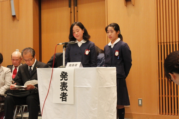 制服を着た小学生が発表している写真 拡大画像 (JPEG: 134.8KB)